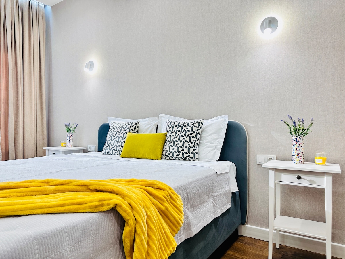 This unique accommodation is characterised by its own style. New, spacious and cosy flat in a unique elite complex. Mesmerising views from the window and thoughtful details in the flat will make your stay unforgettable. On the territory of the complex there are shops, restaurants, coffee shop and much more. In the immediate vicinity of the apartment complex there is everything you need. In 5 minutes walk is the largest in the city shopping centre MEGA.