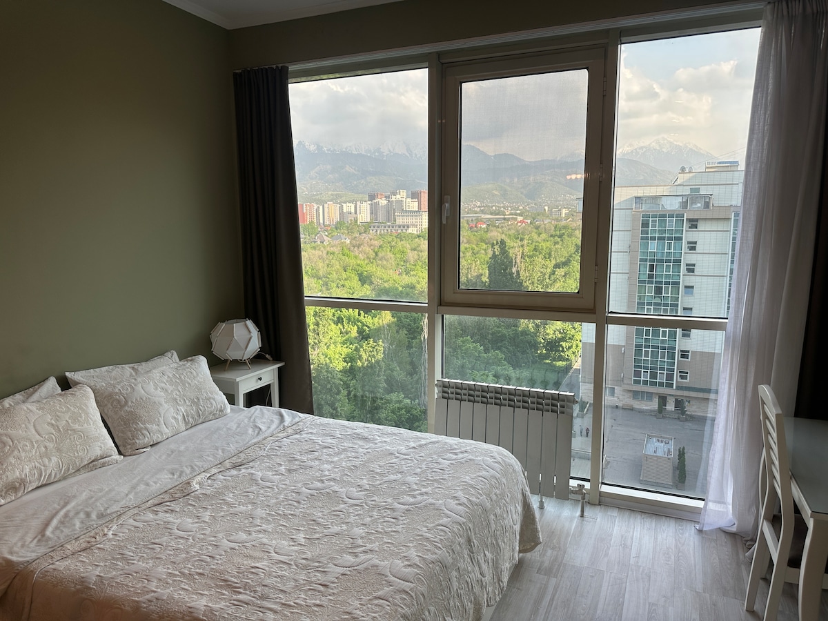 Welcome to your ideal stay in Almaty! Enjoy breathtaking mountain and city views right from your window. -7 minutes to Metro Station -сomfortable bed and cozy sofa -fully equipped kitchen -modern bathroom with fresh towels and toiletries - Wi-Fi and SmartTV The apartment is located in a safe and lively district, close to cafés, supermarkets, pharmacies, shopping malls! Self-check-in available Always ready to assist you — feel free to message any time. Relax, explore, feel at home!