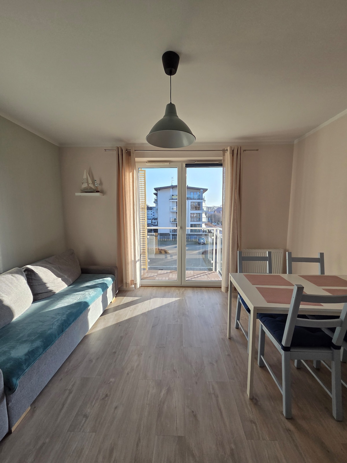Apartament 30m składa sie z sypialni, łazienki i salonu z aneksem kuchennym, zlokalizowany na 2 piętrze w nowym obiekcie z windą ok.150 m do plaży i Restauracji. Apartament położony przy ścianie lasu. Do apartamentu przynależna jest mała piwnica w której znajdują się leżaki, parasol,parawan oraz 2 rowery do dyspozycji gości. Internet bezprzewodowy do 10 MB. Przy budynku darmowy, zamykany parking ,pilot do bramy przy kluczach. Blisko też znajduje się duży supermarket . Brak pralki.