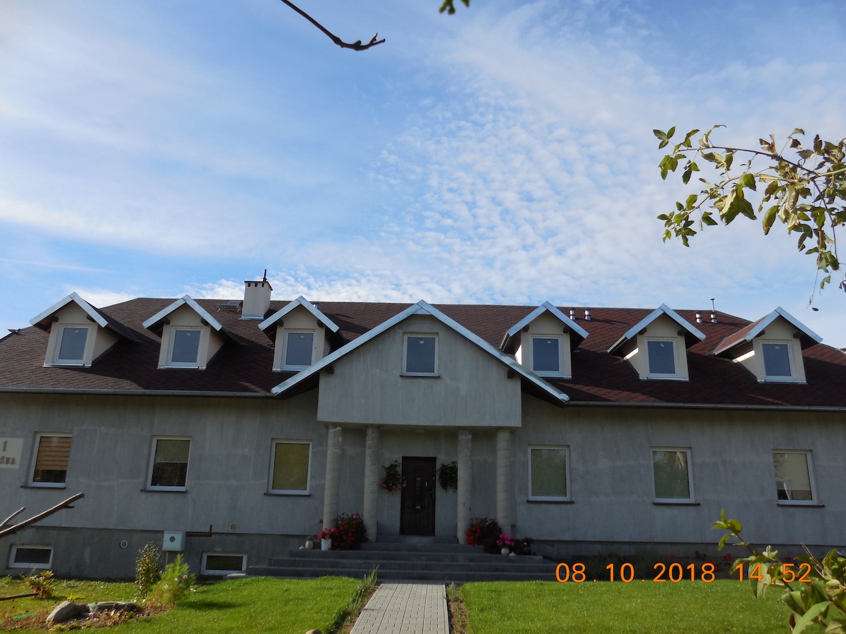 Komfortowy i piękny obiekt przeznaczony na wakacje dla rodziny. Nowy dom piętrowy przeznaczony jest w całości do użytku gości. 2 łazienki, 2 sypialnie, salon z kominkiem, ogromny taras wypoczynkowy sprawią, że Twoje wakacje będą wyjątkowe. Dodatkowo do dyspozycji gości jest palenisko do zrobienia grilla. Lokalizacja obiektu przy lesie oraz wśród bujnej roślinności ogrodowej wpłyną zbawiennie na samopoczucie I pomogą się zrelaksować i zapomnieć o problemach. W pobliżu są jeziora i plaże.
