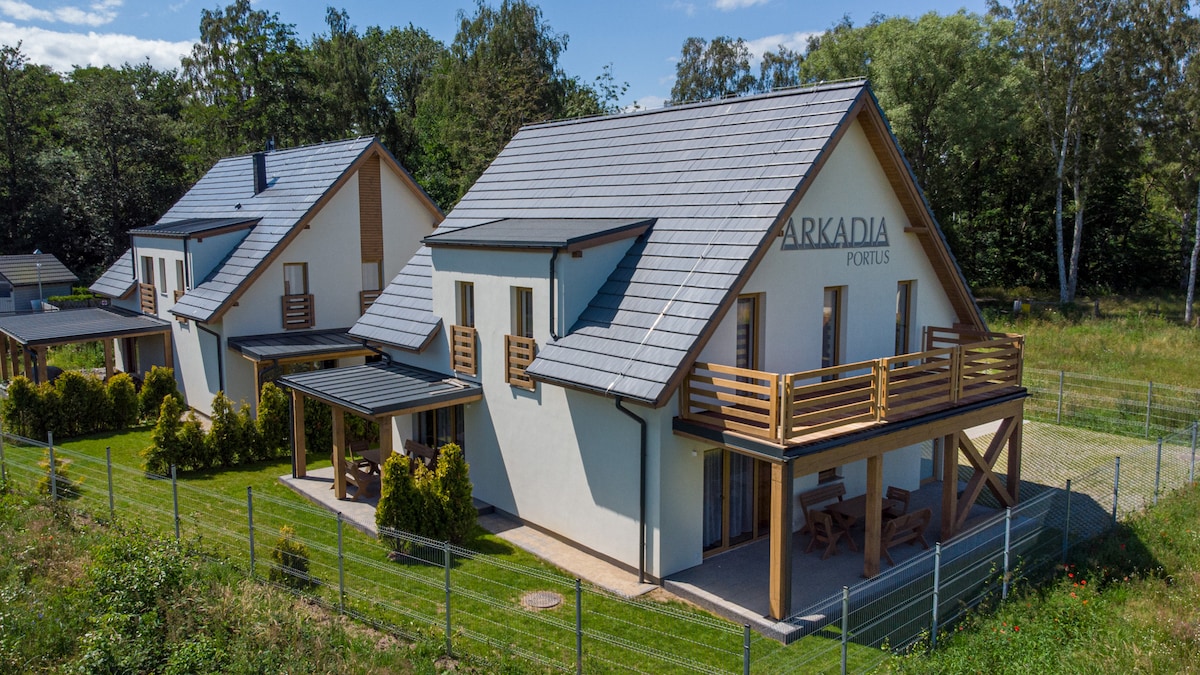 This is a beautiful, 175qm large luxury holiday house-built in 2016 on a 900 sqm large, fenced plot. It's located on WOLIN island (Western Polish Baltic coast),10km east from Miedzyzdroje. You can find here an absolute tranquility.The house is located 50m from Wolin National Park (a great forest) and 1,2km through this forest to the beach. The beach itself: wide, wide, long, white sandy beach. In the house: a fire place+ sauna and 5 bed rooms (4 x double bed + 1 room with 2 bunk beds for kids)