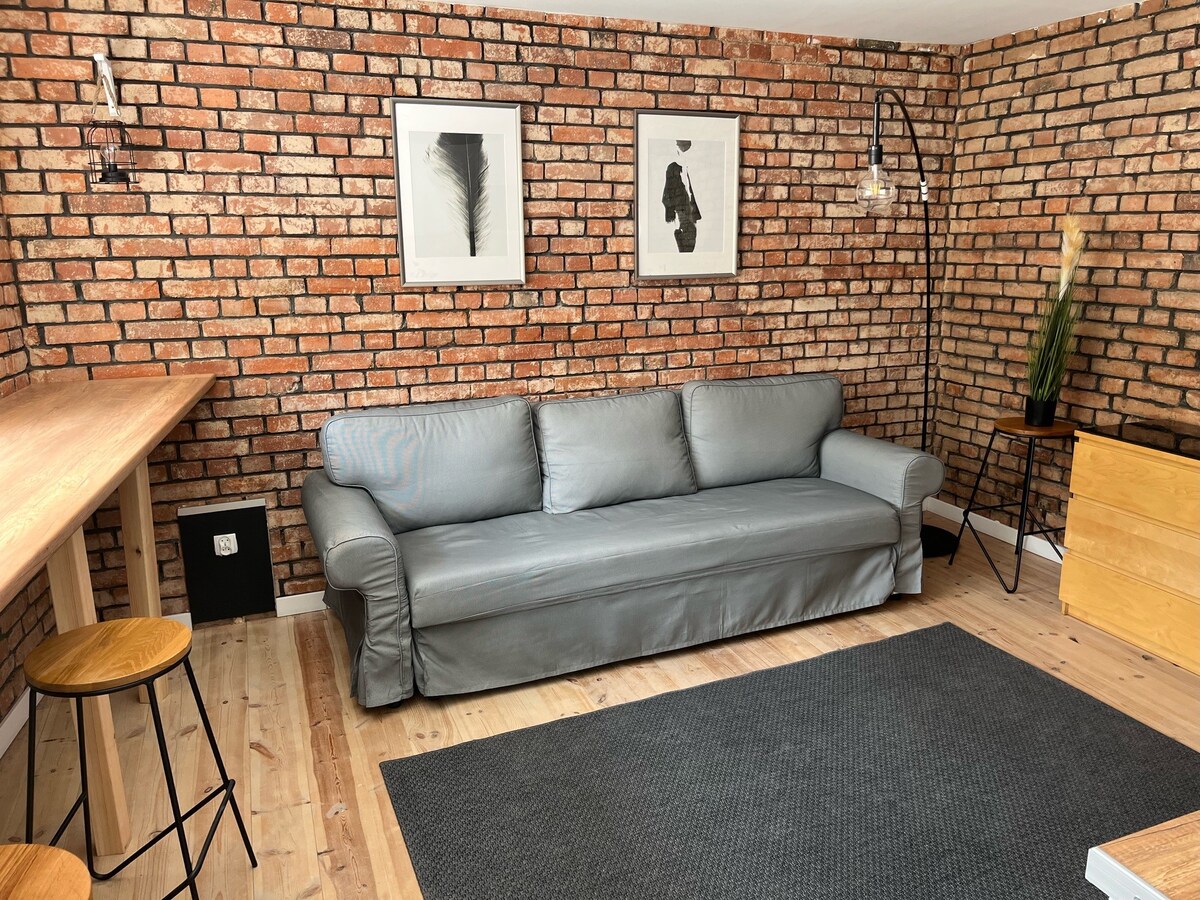 We invite you to apartment no. 6 in Karpniki in the atmospheric interior of the former mill. There is a bedroom, a bathroom with a shower and a living room with a kitchenette and a sofa bed for 2 more people. The view from the living room extends to Karpniki and the Karkonosze Mountains. The apartment has 1 parking space on the property. Please note that it is old building with wooden ceilings. That means you might hear the sounds from other apartments that are upstairs.