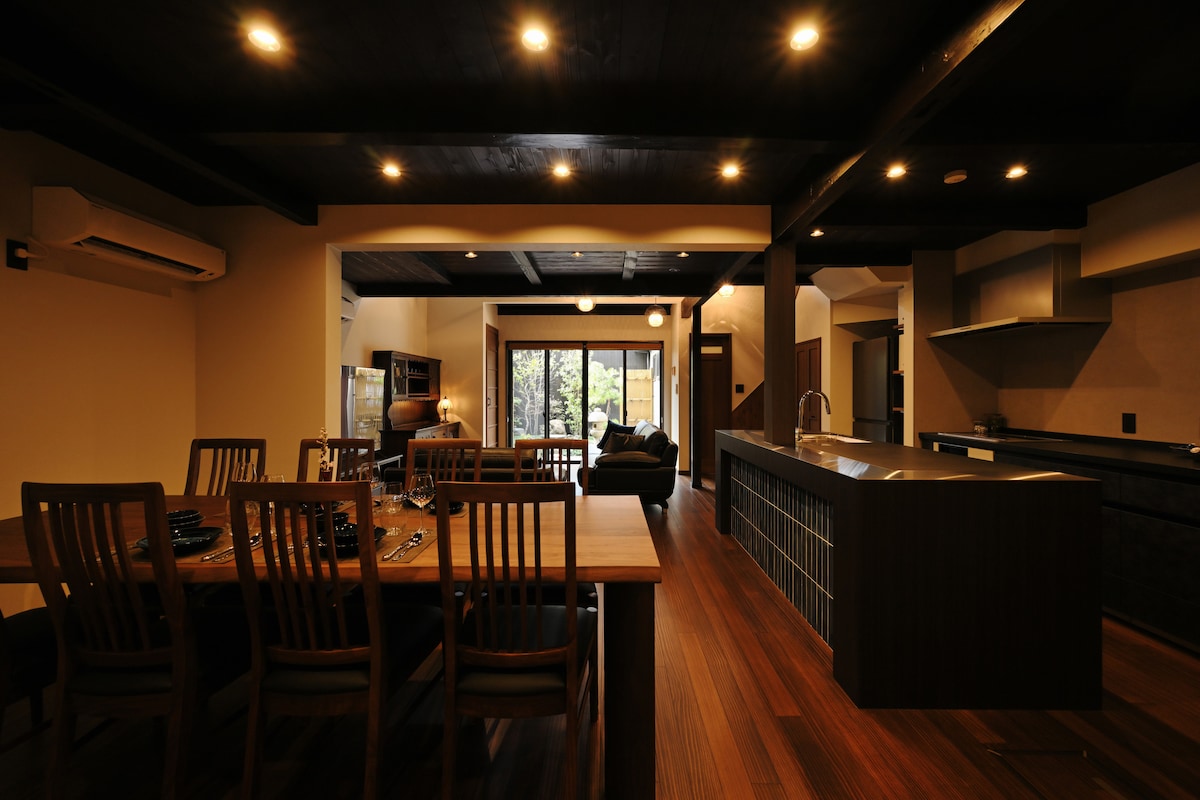 京都御所から近く、京都の中心地に佇む京町家を全面リノベーションしたデザイン性も高く居心地の良い京町屋の宿泊施設です。 1棟貸し切りで、115㎡の広い家。吹き抜けのリビングは解放感があり、ゆったりとお寛ぎいただけます。日本庭園もあり古き日本の雰囲気を感じていただけます。 お風呂からも日本庭園が望めます。ゆったりとしたベッドルーム。キッチン完備で暮らすように京都に滞在していただけるお宿です。