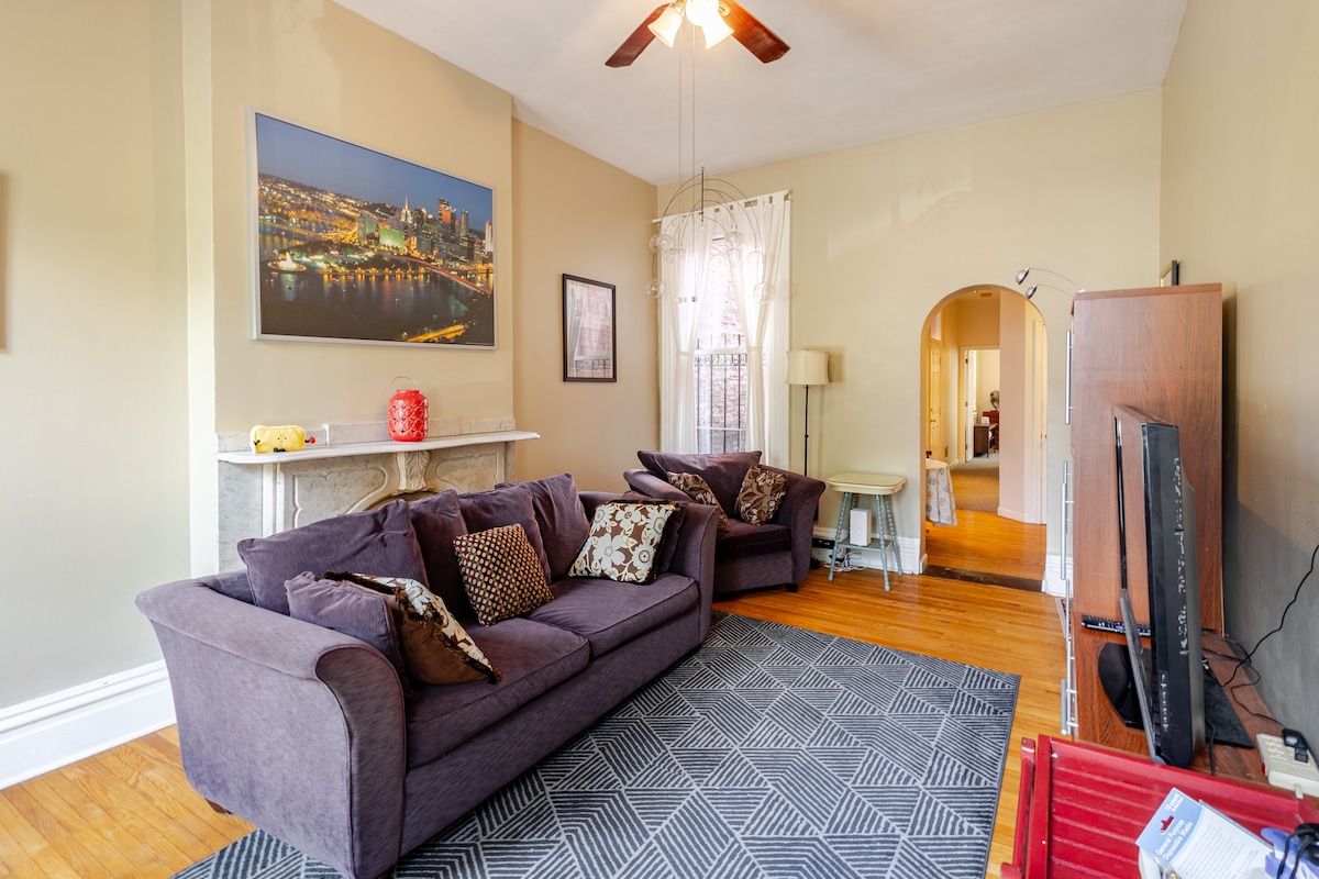 Here's a quiet hideaway. Book the apartment, and reserve a fine meal at a nearby restaurant, and walk to the nearby park. For the price of a hotel room, you get living and sunrooms, a complete kitchen with parking, washing, ironing, and excellent internet access. You are close to concerts, parks, museums, stadiums, AGH, and fine restaurants. This apartment is a great center to explore downtown and the Northside of Pittsburgh. You and your pet will like the large park, only a 1/2 block away.