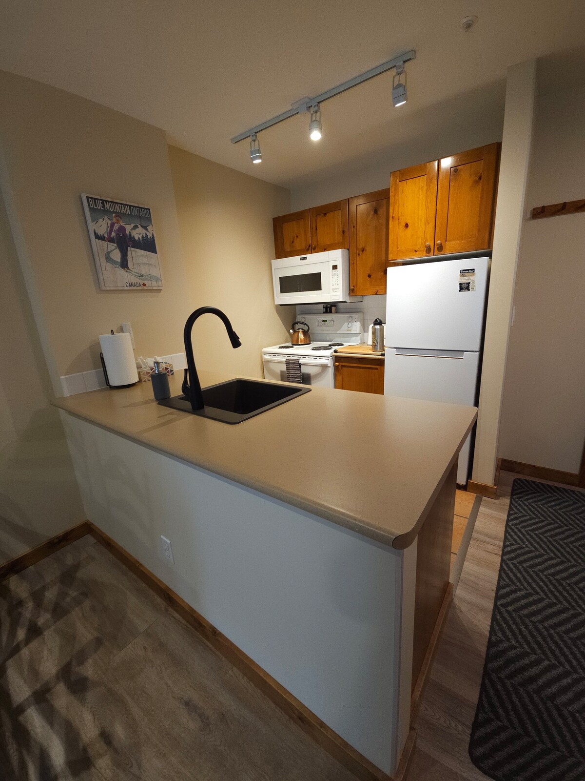 Enjoy our clean, newly updated main floor 1 bdrm, 1bath, 600 sqft condo. Ski in to the back door,walk across the quiet street to ski out to village to main lifts. Under 5 min stroll to the village, including new NHL size skating rink across the street. One of the closest condos to village and lifts. Ski to back door and lock up skis in locker in the back. Condo has full laundry, gas fireplace, assigned parking spot. *If you need 2, 1 bdrm condos, check out our other main flr unit 17 w hot tub*