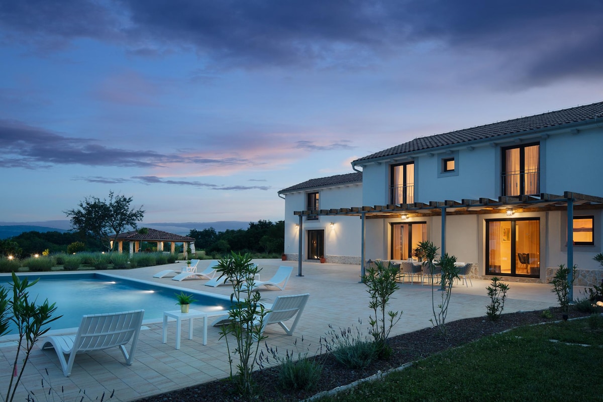 Villa Maru is nestled in the picturesque village of Brseč, perched on an elevated position above the Kvarner Bay, offering breathtaking views of the sea and the island of Cres. This spacious and elegant villa provides the perfect setting for a relaxing holiday with family or friends, combining ultimate comfort with complete privacy. Accommodating up to 12 guests, the villa boasts six spacious bedrooms, each radiating warmth and style.