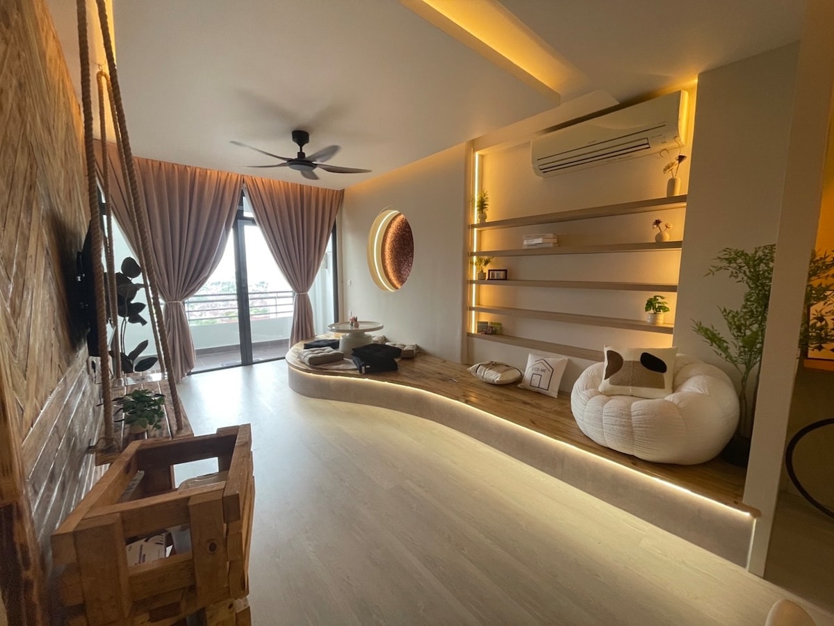 Experience refined elegance at The Nordic, a homestay designed with timeless European charm and modern comfort. Featuring soft neutral tones, grand wall art, and chic furnishings, this space creates a calm yet luxurious retreat. Perfect for couples, families, or friends, it blends minimalism with sophistication — from the cozy living area and stylish kitchenette to the serene bedroom with floor-to-ceiling windows. A serene stay where classic design meets modern lifestyle.