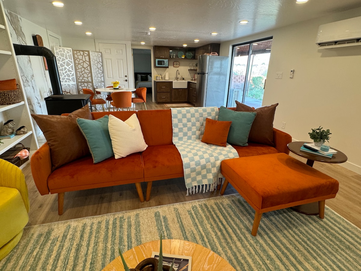 Enjoy a newly remodeled basement retreat with retro charm and amazing red cliff views and dark starry nights. This 2-bedroom/2-bath suite offers 1,000 sq ft of bright, clean, open space with a private entrance on 1.25 acres. Ideal for families or travelers seeking privacy, comfort, and convenience—just minutes from Kanab’s restaurants and grocery stores. Features full-size fridge, coffee maker, air fryer, hot plate, and washer/dryer Please note NO OVEN but it does have a hot plate for cooking