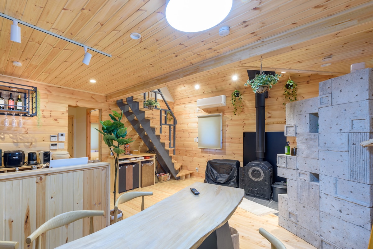 2024年8月オープン。 新築の一棟貸切のログハウスとなります。 フィンランド発祥の本格的な欧州式ログハウス"PUPU"を心ゆくまでお楽しみください。 2024年4月オープンのフィンランド式の貸切ログサウナも併せてお楽しみいただけます。 【貸切サウナ】※有料 定員2ー6名様∔幼児 3部制 ①15:30-18:30 3h ②19:30-22:30 3h ③翌7:00-9:00 2h ご利用料金 / 1回 1名様につき 大人5,000円 小学生4,000円 幼児2,000円 朝の部は上記価格より2割引 事前予約はDMもしくはステップハウス山中湖公式サイトより可。 事前に1枠予約いただけます。 ※幼児を除く利用人数 注)水風呂は冬季凍結のため使用不可 サウナルール ・ロウリュ可 ・アルコール不可 ・水着着用 水着を必ず持参ください。 【キッチン】 食器・調理器具一式、 塩・胡椒・サラダ油・醤油は常設。 【BBQ】 ガスグリルレンタル料金3,000円/1回につき 22:00まで利用可。 食材持込にて夜10時まで利用可。 ※屋外テラスの為、悪天候の場合は利用不可の可能性あり。