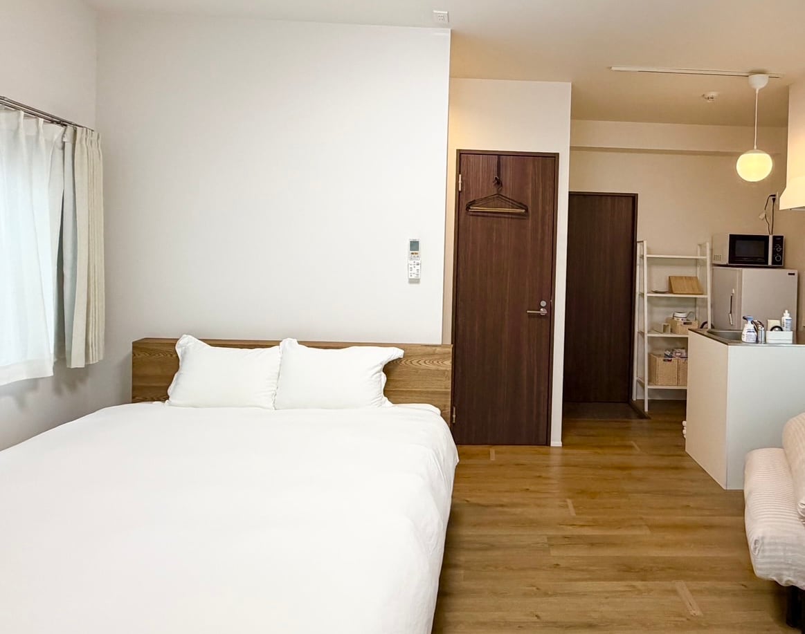 Newly Reformed Feb 2026! Private apartment studio for max 3 people stay. Room Size: about 35㎡ Room layout: ・1 double bed ・1 sofa bed ・1 bathroom Hotel Facilities ・Shared coin laundry is available ・Private entrance for each unit ・No elevator, use stair only Weekly, Monthly and longer stay is available. ** No Front Desk / Self- Check-in with Door code **