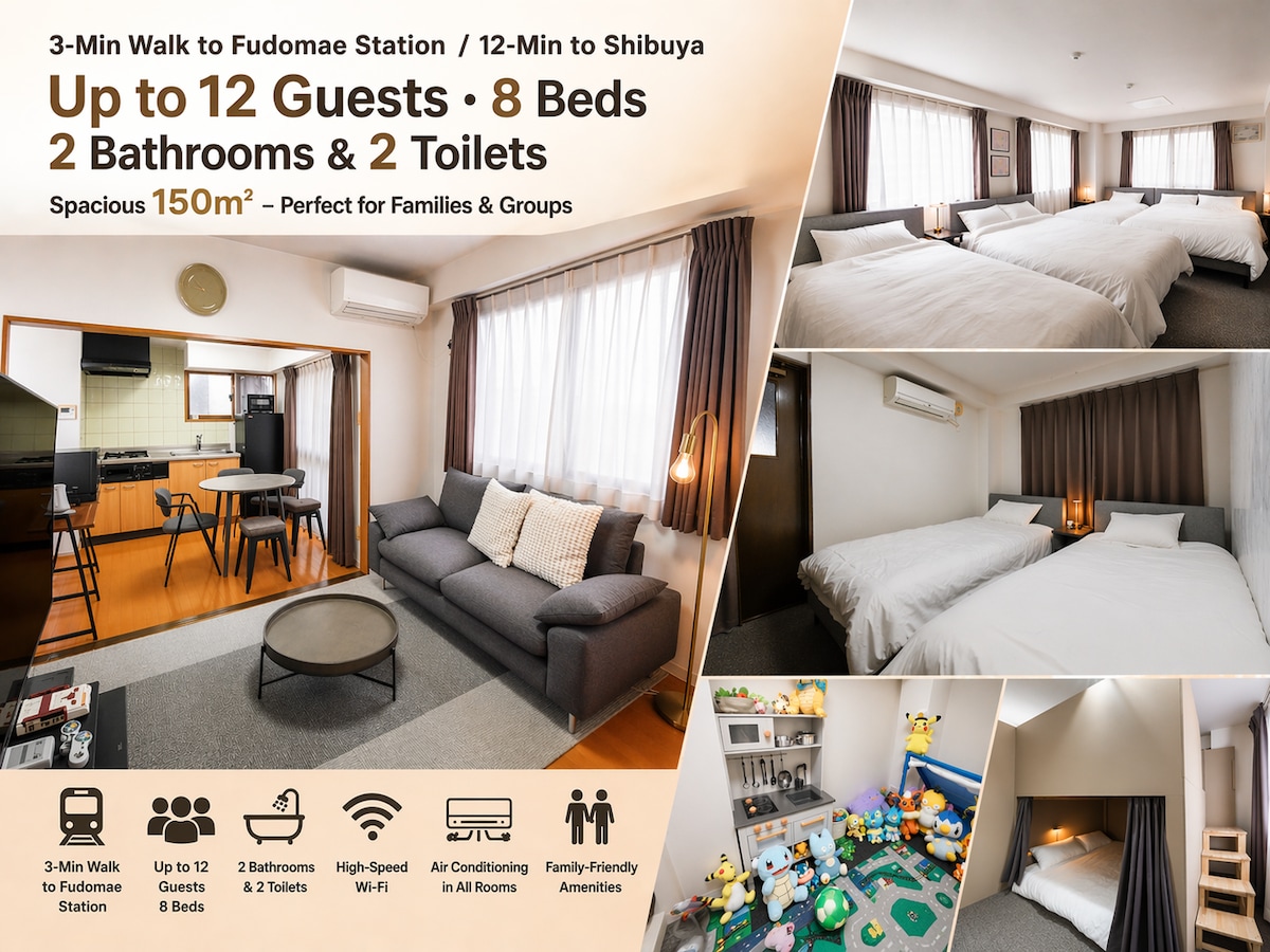 不動前駅徒歩3分|渋谷12分|8ベッド|2浴室2トイレ|駅近便利で快適グループステイ