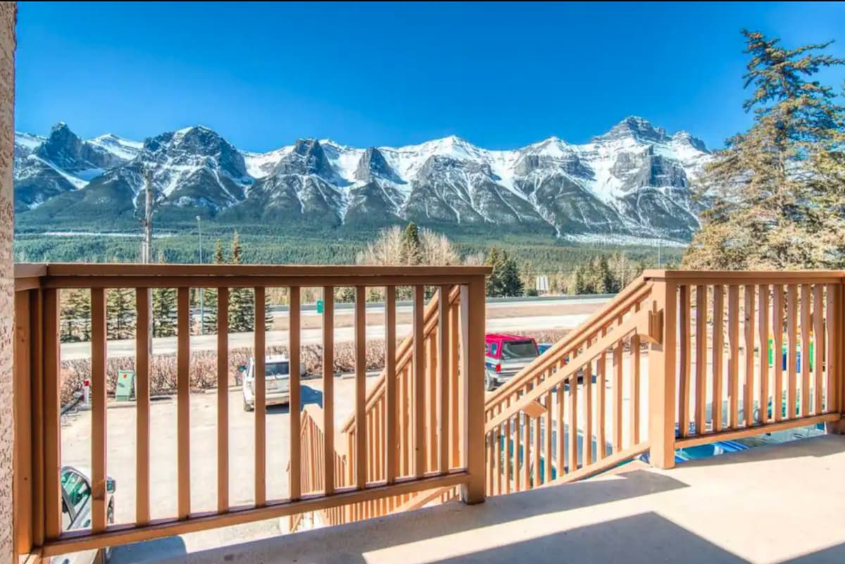 Relax on the private balcony with a cup of coffee as you watch the sunrise over the mountains. And only 1 min away from the Banff National Park gate! This vacation home can accommodate up to 7 adults and 1 kid. - SUPER comfy beds - 100+ TV Channels - In suite Laundry - WIFI - A private balcony with gorgeous mountain views - A gas fireplace - A spacious fully equipped kitchen - Air Conditioners - A huge backyard with BBQ grills(Shared) - Plenty of free onsite parking