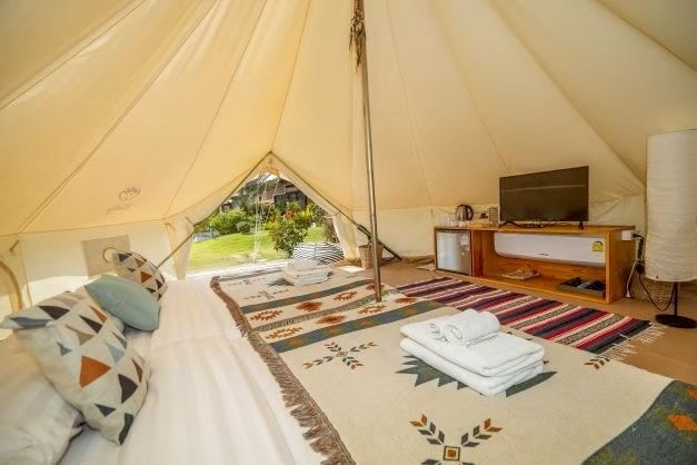 Enjoy the sounds of nature when you stay in this unique place! Unwind in our spacious Family Bell Tent sleeping 5 (2 queen beds + optional single). Enjoy modern comforts: AC, ensuite bathroom & hot shower. Your stay includes complimentary breakfast with pool views, plus free Wi-Fi, parking, towels/toiletries & 24/7 support. Many free activities and enjoy camp fire at night by the river and under the stars. Perfect for adventurous families or couples seeking unique glamping!