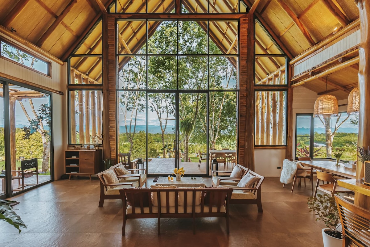 Our family's weekends hideaway home, Baan Plearn-Pleng, is right next to Kwai Yai River surrounded by greenery trees and beautiful natural scenery of mountains, forrest and river. Located in 2 acres land, our house is in modern glass house style with panoramic view of nature. You can enjoy swimming & kayaking in the river, relaxing on the river pier and enjoying the fascinating nature and serenity. A luxurious slow life living in the middle of nature that is perfect for your city escape.