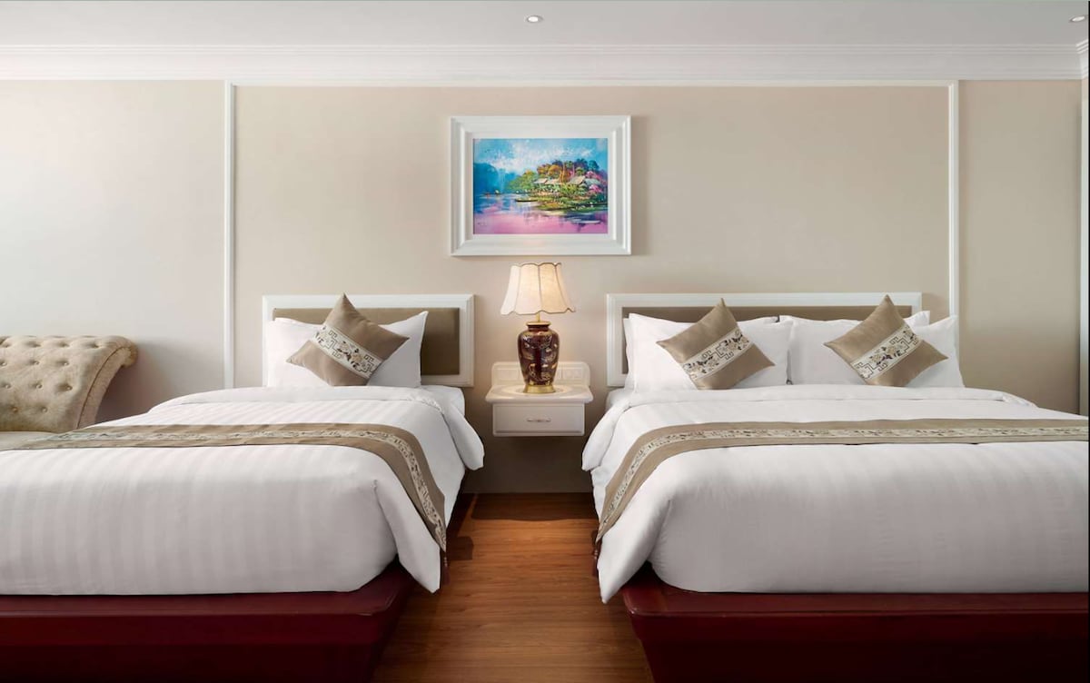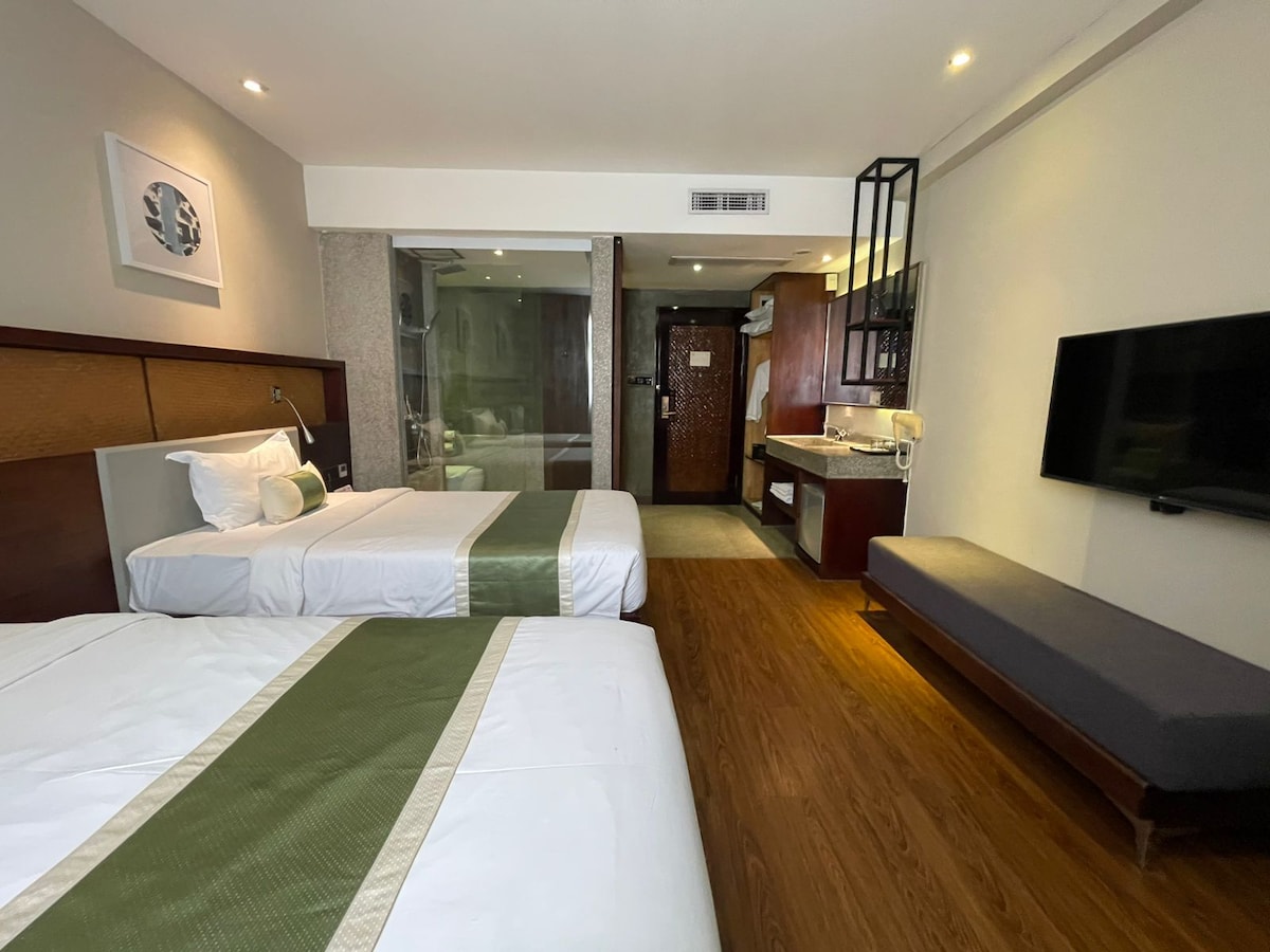 Deluxe Double Room offer luxury and spaciousness with city views. king size bed and large private balcony. Rain shower, hairdryer, complimentary toiletries, robes, slippers, remote-controlled air- conditioning, flat-screen TV, writing desk with effective Wi-Fi, mini bar, complimentary daily drinking 02 bottles water, electric kettle with tea/ coffee making facilities and a wake up service. Included are complimentary Western or Asian breakfasts, your room is made-up daily.