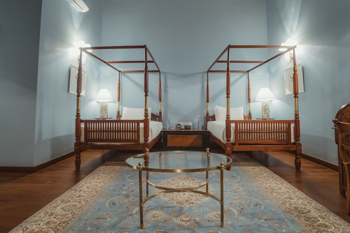The Butterfly Suite is the only twin suite in the property, this lush room features two double four poster beds among stunning sky blue interiors. Guests can get lost in their thoughts looking out to the garden from the comfortable window seat or write postcards home at the antique writing desk. Also features a TV and mini-bar fridge for guest use. The bathroom is grand and spacious featuring a double vanity and walk in shower. Rates include breakfast. This property is located 12km to Kandy