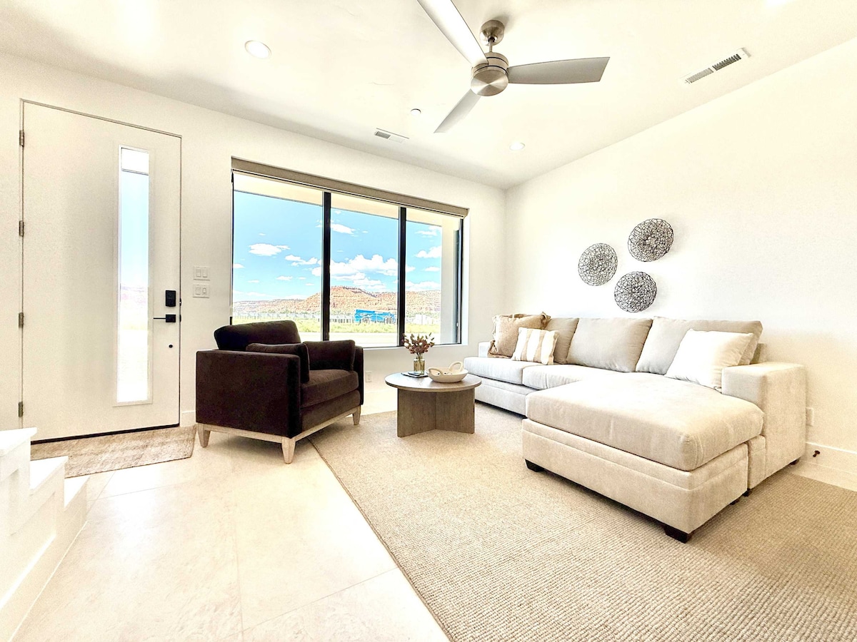 Breathtaking vistas in every direction! Luxurious 3BR home in Kanab, Utah, near Zion, Bryce & Grand Canyon. Features rooftop stargazing, spa-style baths, designer decor & premium beds. Enjoy indoor/outdoor pools, pickleball, & dog park in the community. Pet Friendly. Sleeps 6 with full kitchen and large windows to take in the 360° red rock views. Perfect for families, couples & adventurers looking for comfort + access to southern Utah’s national parks. Book your red rock escape today!