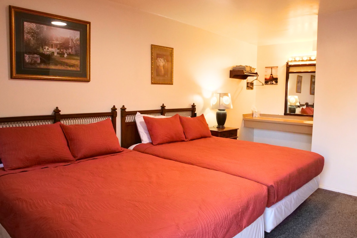 2 Queen Beds with Private Bathroom at the clean and cozy Travelers Motel! Located right on Highway 89 in Downtown Kanab. Smart TV with Netflix and Disney+ Included! Stocked with shampoo, conditioner, body wash, face pads and q-tips. Free To-Go Coffee for all our guests! Perfect for an affordable stopover on road trips, or a chance to enjoy Kanab! Maverick next door for drinks and snacks :) Hosts are always available during your stay on Airbnb messaging Self check-in and easy check-out!
