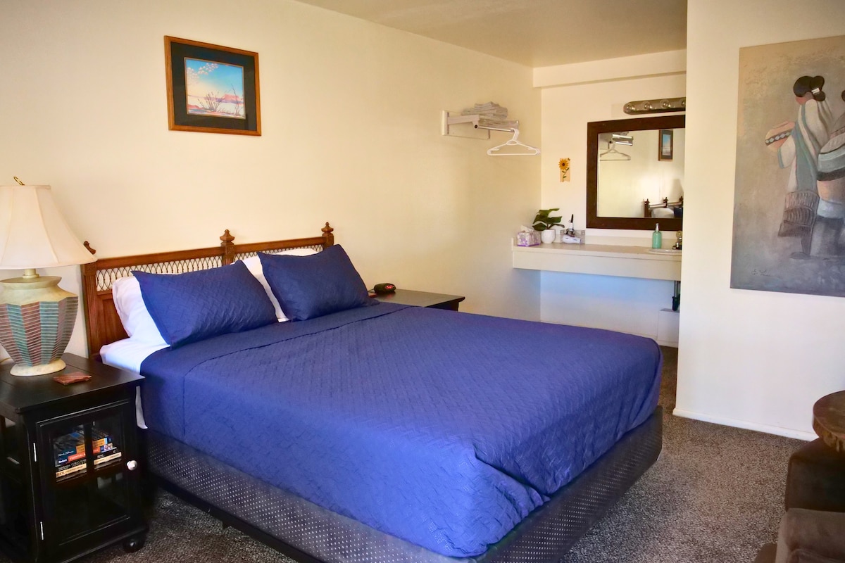 Queen Bedroom with Private Bathroom at the clean and cozy Travelers Motel! Located right on Highway 89 in Downtown Kanab. Smart TV with Netflix and Disney+ Included! Stocked with shampoo, conditioner, body wash, face pads and q-tips. Free To-Go Coffee for all our guests! Perfect for an affordable stopover on road trips, or a chance to enjoy Kanab! Maverick next door for drinks and snacks :) Hosts are always available during your stay on Airbnb messaging Self check-in and easy check-out!