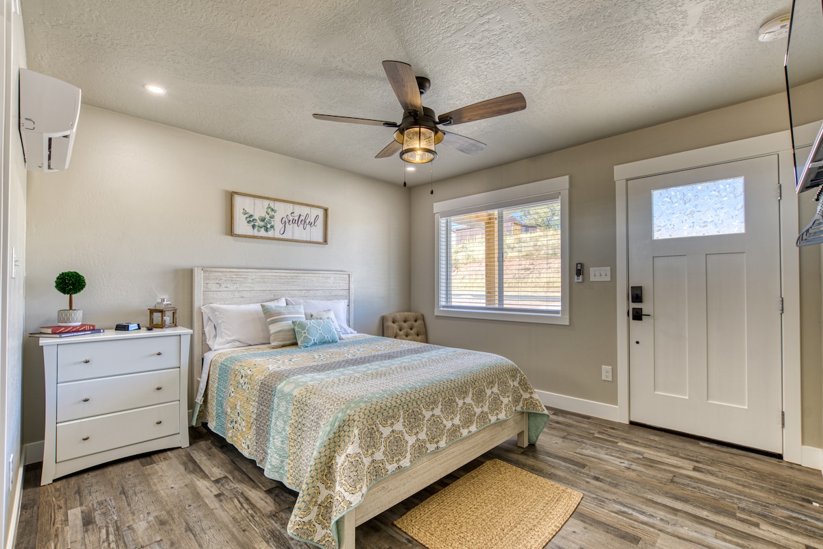 Relax at this peaceful Kanab retreat surrounded by red cliffs and fresh country air. Perfect for couples, adventurers, and National Parks explorers, this sunny studio features high‑speed Wi‑Fi, a dedicated workspace, self‑check‑in, and a covered porch with stunning views. Just minutes from dining, local shops, and entrance routes to Zion, Bryce, and Grand Staircase‑Escalante. Your ideal Utah adventure basecamp!