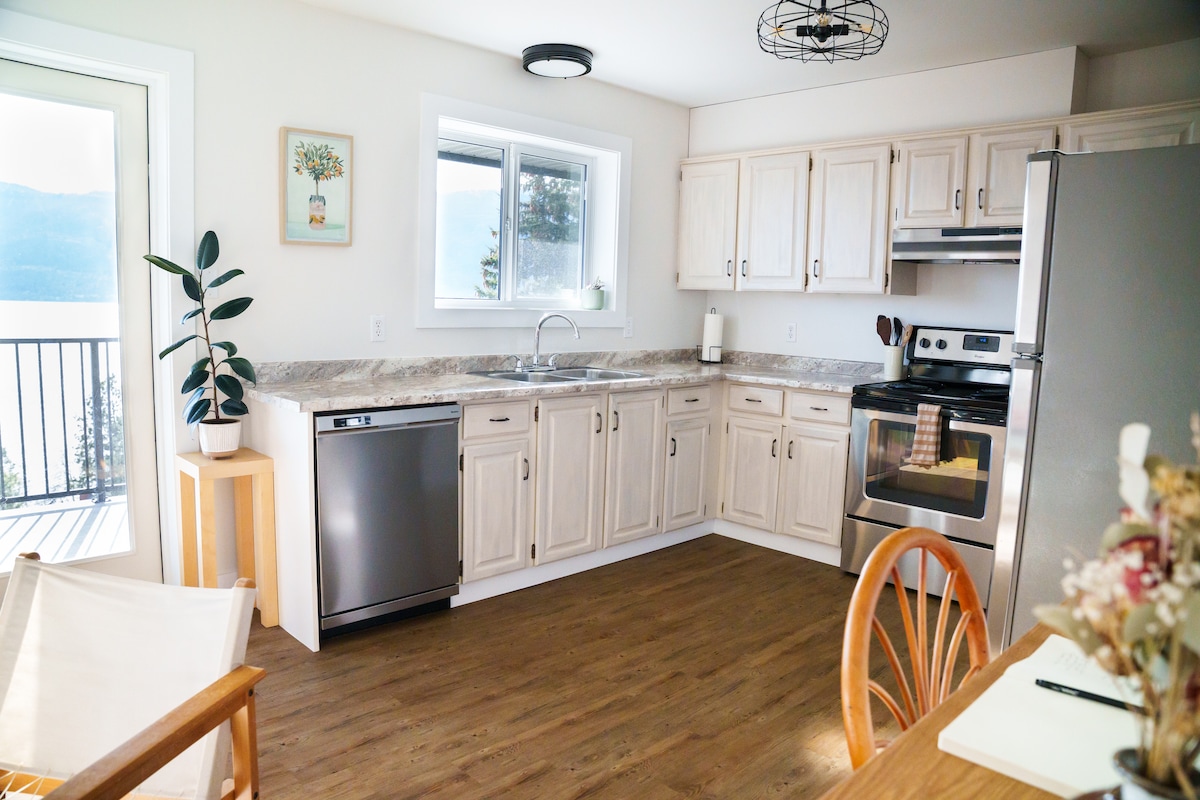 Unwind in this serene 1-bedroom suite, short drive from lakes, beaches, wineries, orchards, and ski resorts. Enjoy stunning mountain, valley, and Wood Lake views from your covered private patio. Features a cozy queen-size bed, pull-out couch, full kitchenette, and modern bathroom. Perfect for adventure or relaxation, this inviting retreat is your home away from home! Home SUITE home! BC Short term Registration number : H640934759