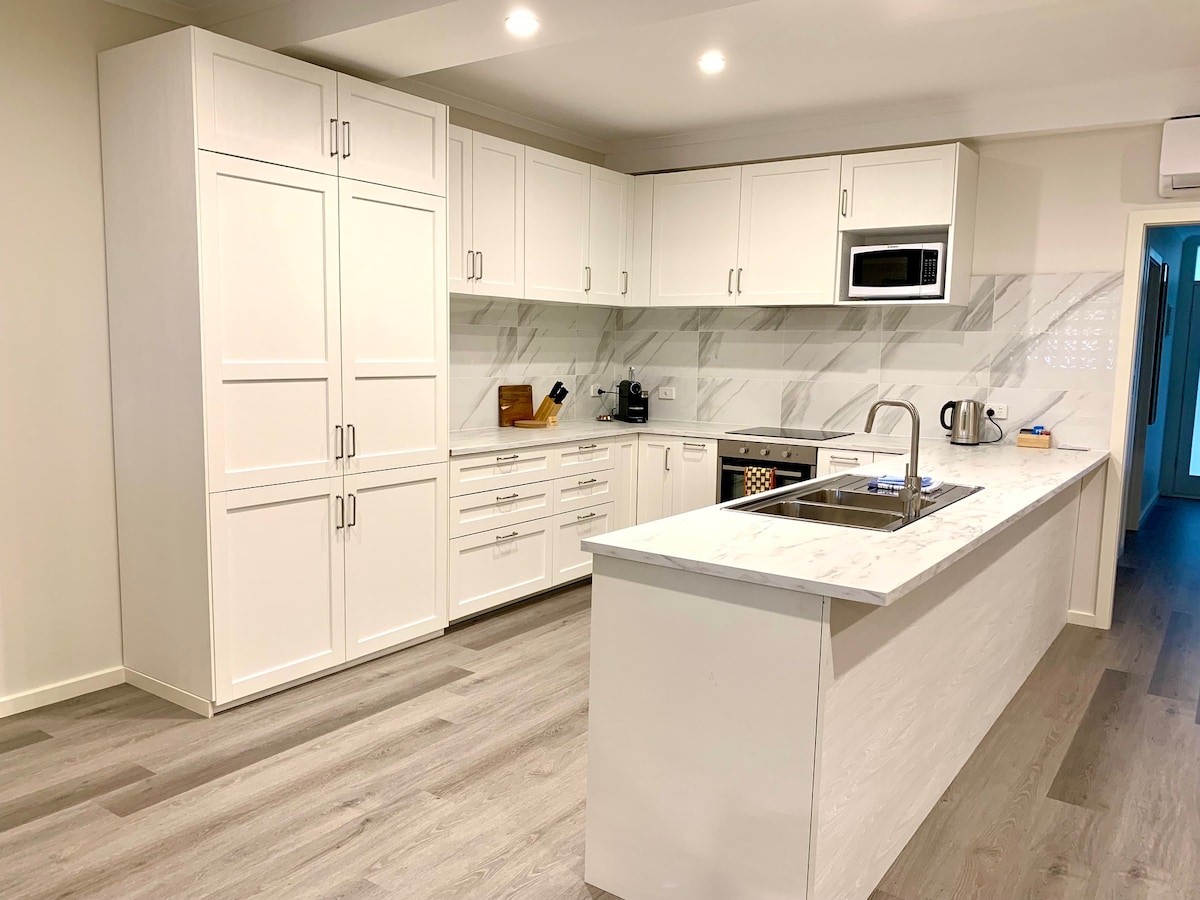 This professionally designed, built and decorated apartment features a large deck under shade with quality doors and screens. Fully insulated and air conditioning as well as the soft colours and paintings provide a quiet retreat. European single duvets for the queen size bed can be provided on request. The bathroom is large with under bench laundry. The internet is very high speed. Coffee shops, restaurants and supermarket, all nearby. Kingscote Travel can assist with discounted travel fares.