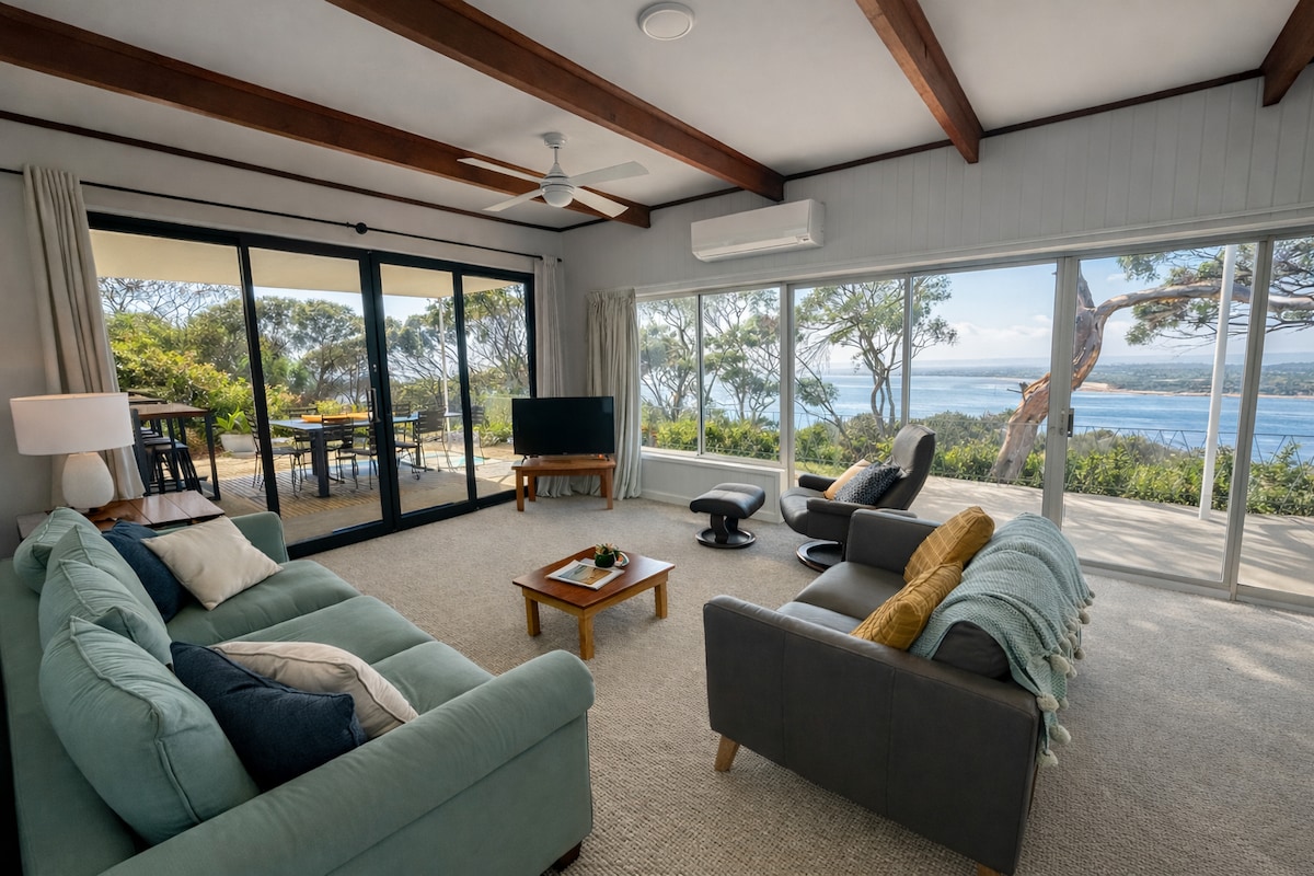Belle Beach House has been a favourite of many for years with so many coming back time and time again! Large living areas, outdoor living, heated swim spa & magnificent views! A minutes walk to the white sand. Large living spaces, fully equipped kitchen and BBQ, air conditioning and wood fire. Take a kayak out, read a book, watch the wildlife, enjoy the games and pool table. Do nothing or tour the island. For larger group bookings of more than 8 please contact us first. Linen provided.