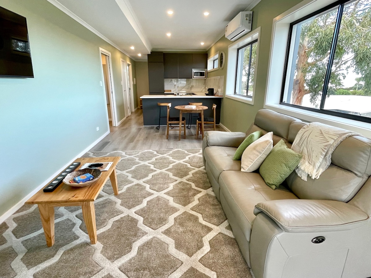 Named after Kangaroo Island's pristine rivers, "Two Rivers - Cygnet" is one of two exciting apartments offering stunning views of Nepean Bay. Thoughtfully styled with modern elegance, plush bedding & luxurious linen, we aspire to ensure your comfort & exceed expectations. Set in a quiet estate of Kingscote, one street from the beach, a perfect location from which to base your island adventures. Return to relax on the spacious deck whilst indulging in complementary wine and local produce.