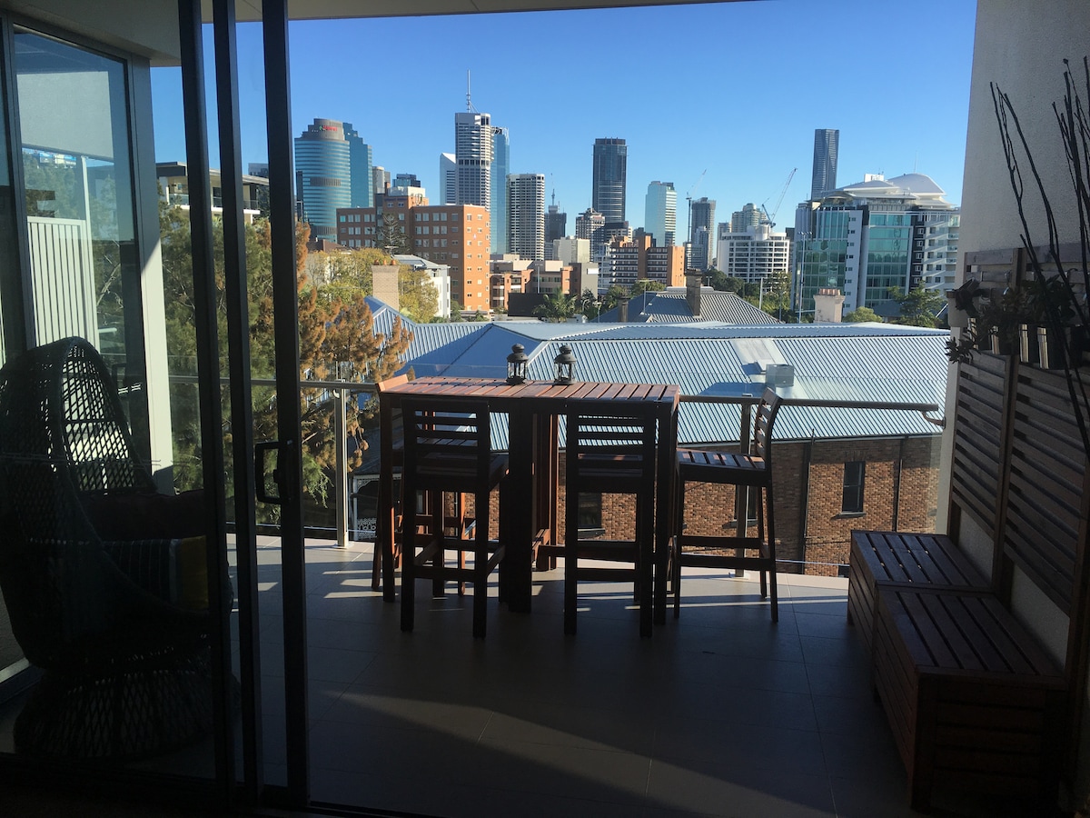 Penthouse apartment right in Kangaroo Point with Brisbane City views. A wonderful 1 Bedroom apartment, amazing location only a few minutes drive, 15 min walk across the green bridge or ferry into the city. Shops and Cafes nearby and great views of the City and the Story Bridge. Complex has a large pool and grass/BBQ area, as well as a function room. We have a balcony with an outdoor setting, as well as a comfy egg chair for you to have your morning coffee and catch up with the world.