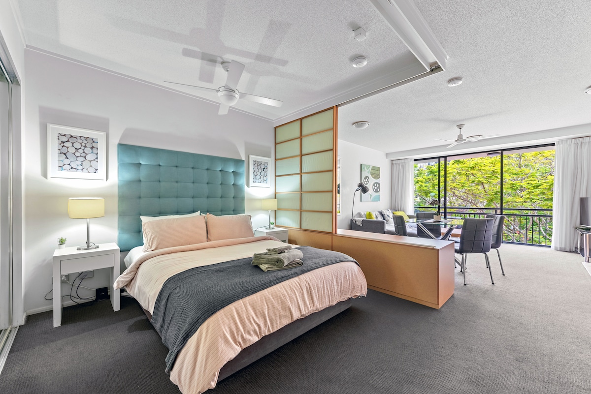 Our stunning riverview & botanic-garden view king-sized one bedroom apartment is perfectly for short term and long term stays. Situated in inner CBD, Brisbane’s SkyTower building is close to everywhere! Apt features include: -Spacious bedroom with King size bed and built in wardrobe. Fresh towels and linen provided. -Sofa bed in living area -Central air conditioning -Gas stove top with full chef’s kitchen -Hide away laundry area -Washing machine and dryer -Coffee machine -Smart TV -Free WIFI