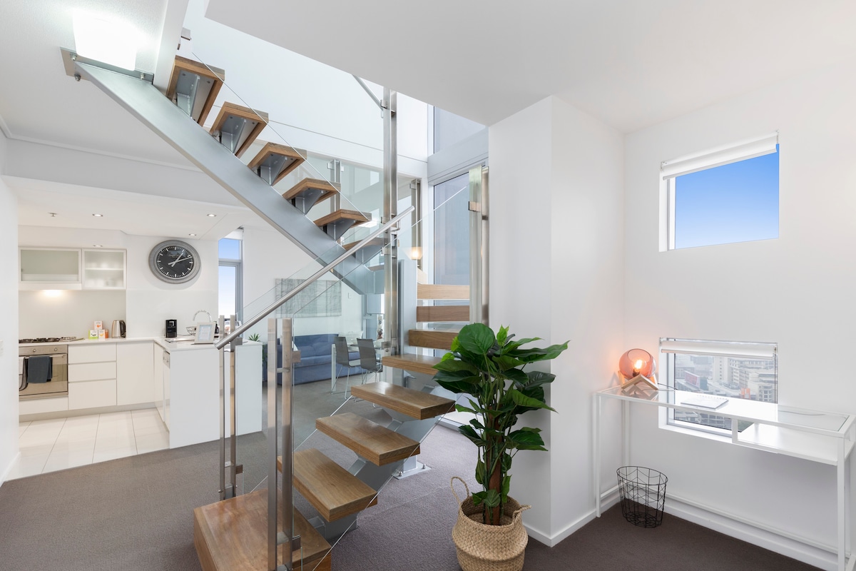 Experience luxury in our 2-level sky home that feels like a penthouse, featuring a floating wooden staircase, two spacious living areas, and floor-to-ceiling windows with breathtaking city skyline views. Perfectly located near Howard Smith Wharves on the river, this quiet building offers a convenient and memorable Brisbane experience perfect for families, executive stays, and larger groups. Book your stay at our stunning Skyline Apartment and experience the best of Brisbane in style.