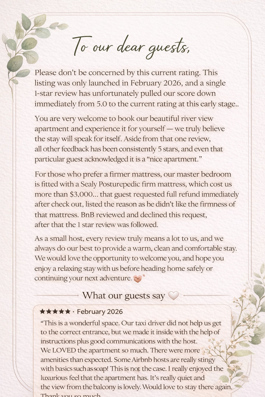 Perfectly located just steps from major CBD office buildings, this spacious and cozy 1-bed apartment offers unbeatable convenience for both business travellers and tourists. Walk to the Botanic Gardens, Eagle Street Pier, Queen Street Mall, and Kangaroo Point via the nearby bridge. Surrounded by riverfront dining, cafés, and shopping streets - everything you need is right at your doorstep. Clean, comfortable, and well-equipped — with parking available on request (subject to availability).