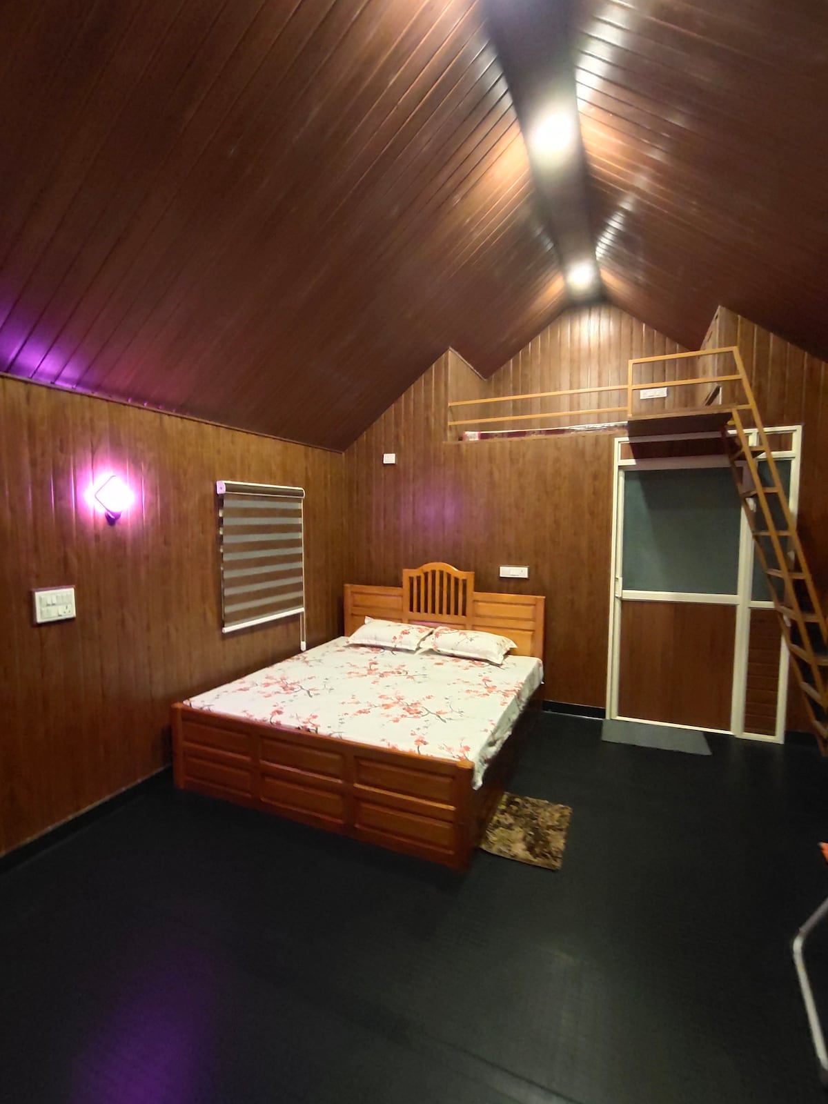 Nestled on a foundation of natural rock ..It's a A FRAME (215 sq ft)structure and a outside area (100 sqft)for campfire and barbeque. Both the deck connects with a 2 metre bridge and the only one in 100 metre circle provide extreme privacy. The property runs on solar so their is no issues on power failure .From road their is a short 80 meters trek to the property makes you feel like you are inside a forest .