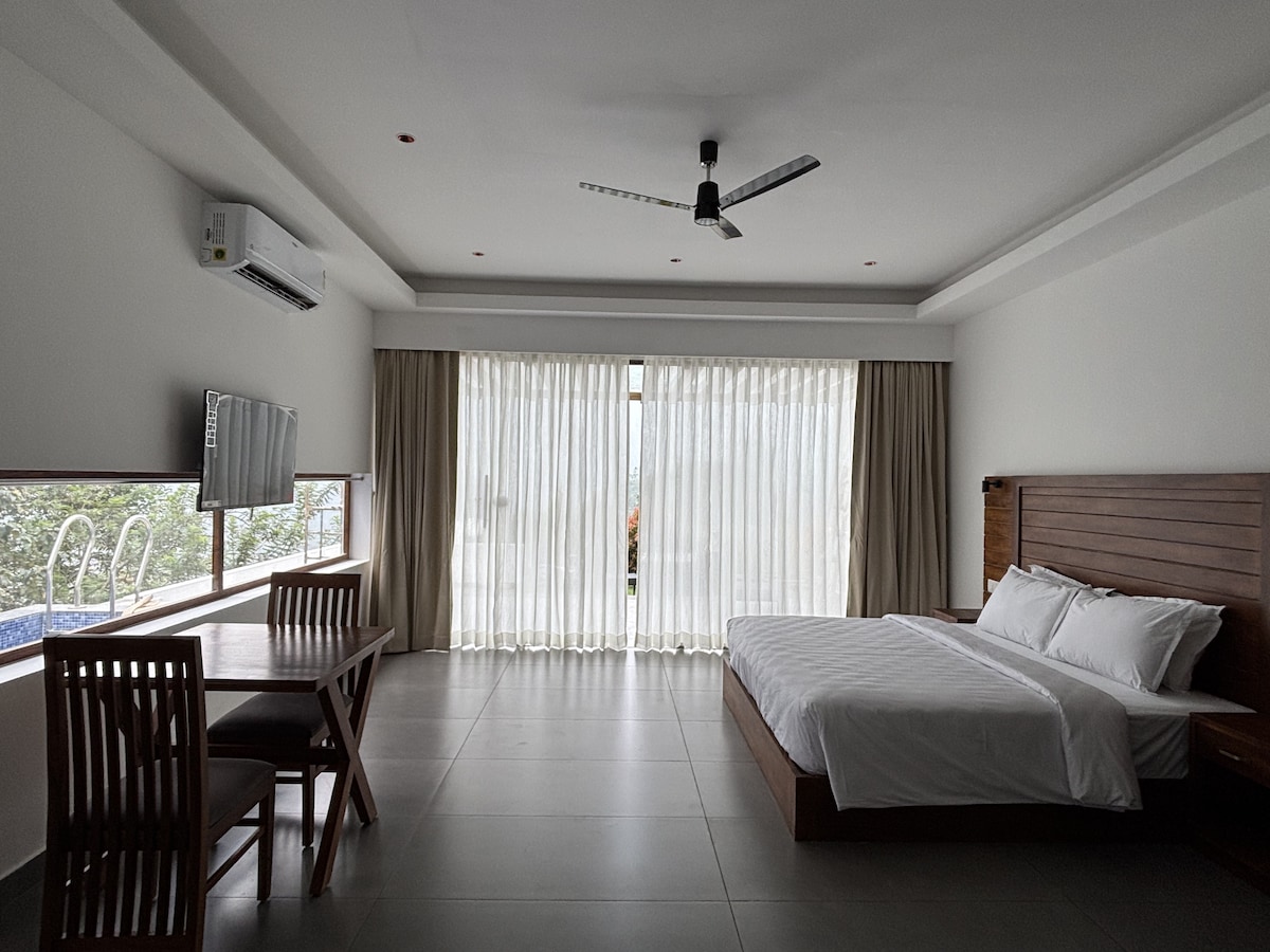 Experience comfort and luxury in our Jacuzzi Rooms at Feel Munnar Resort, nestled in the serene hills of Munnar. Each room features air conditioning, an attached bathroom, a spacious wardrobe, and a private balcony with stunning pool views. Unwind in your king-size bed or indulge in a soothing Jacuzzi soak. Guests enjoy access to our beautiful pool, a large kids’ pool, and a delightful in-house restaurant, making your stay relaxing, memorable, and truly special.