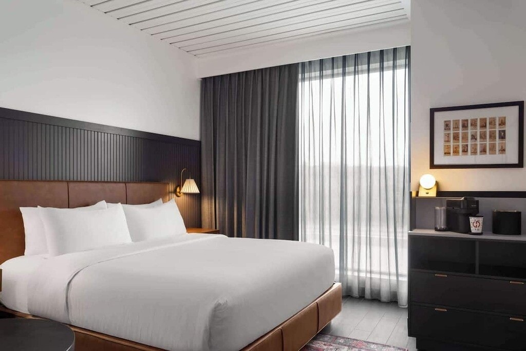 Located in the scenic Berkley Riverfront near River Market, Origin Kansas City blends boutique style with easy access to downtown and CPKC Stadium. This king room features plush bedding, modern décor, and thoughtful Kansas City touches. A relaxing home base after a day of sightseeing or cheering at the game.
