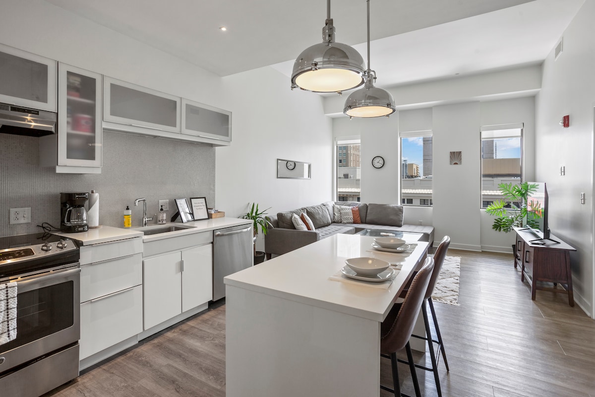 Relax and unwind in this beautiful one bedroom LUXURY apartment on the 15th floor in downtown KC! You are minutes away from all the excitement of downtown, including the Power and Light District! Stay downtown and truly enjoy all that Kansas City has to offer. The apartment is safe and secure with 24/7 security, key card entry to the building, access to all of the amenities, and 1 FREE garage spot that is connected to the building. This is the perfect space to stay during your visit to KCMO!