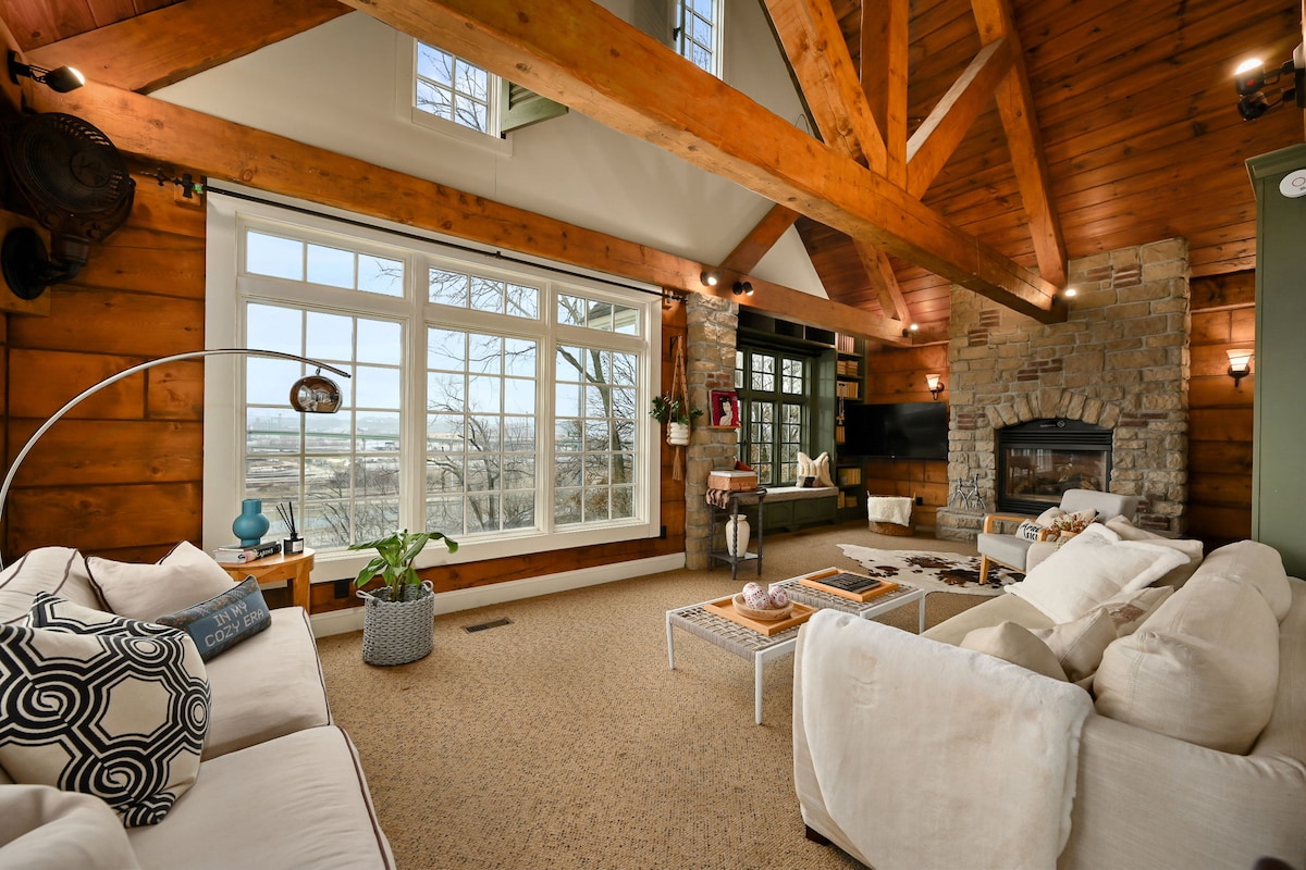 Our beautiful light filled cabin with wood-burning fireplace is perched above our spring-fed 15 acre private lake next to the common outdoor lounge area and sand beach. We have 200 acres of gorgeous property with limestone boulders and hiking trails throughout. The lake is great for swimming, kayaking, stand-up paddle boarding and offers excellent fishing. We are five minutes from downtown Excelsior Springs, Excelsior Springs golf course and 3EX municipal airport. Relax, rejuvenate and play.