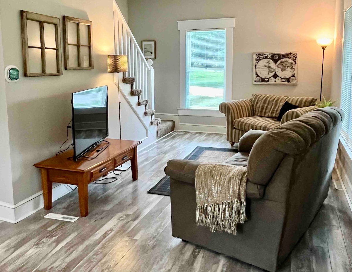 Private Little White House Retreat! Standalone studio in Liberty’s quiet Historic District, 2 blocks to Downtown Liberty Square. 23–25 min to Kansas City. EV charging on-site. Enjoy a loaded coffee bar or visit our Coffee Shoppe across the street, then walk to boutiques, restaurants, historic sites. Relax in a peaceful space with a very comfortable queen bed, large TV w/ DIRECTV, full kitchen, walk-in shower, in-unit washer/dryer—perfect for couples, solo travelers, or restful overnight stays.