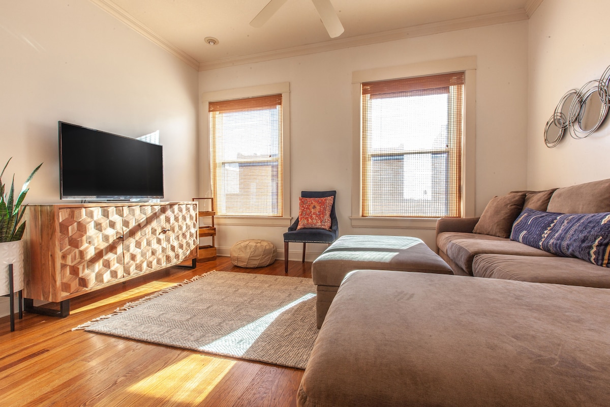 Discover a stunning historic loft in vibrant Independence Square, perfect for 5 guests. This modern, Scandinavian-inspired space features an open floor plan, high ceilings, a dedicated workspace with fast Wi-Fi, and a fully equipped kitchen. Walk to unique boutiques, local dining, and historic Truman sites, Chiefs, Royals and World Cup Games. Ideal for families, remote workers, or a stylish city getaway. Enjoy the blend of 1800s charm and modern comfort in this unique urban retreat.