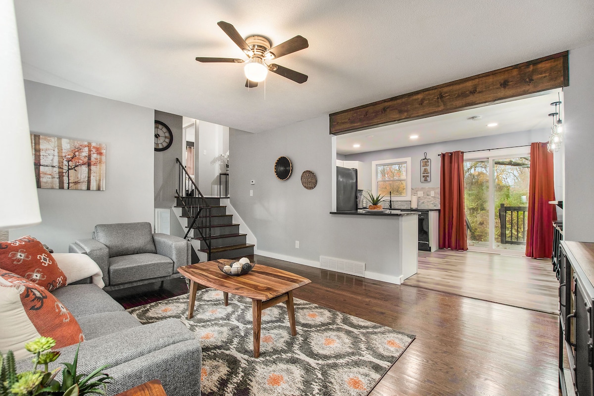 The perfect getaway that's close to it all! Enjoy your privacy at our restored 1933 bungalow on 18 acres just minutes off I-70. Relax after a road trip or gather your friends for a concert. Soak in the tub and get your best night of sleep on a plush mattress. Cook in a stocked kitchen or eat out at restaurants five minutes away. Meander along mowed paths, and let the kids play! We are pet-friendly, and business-ready with Gigabit Internet and an office setup.
