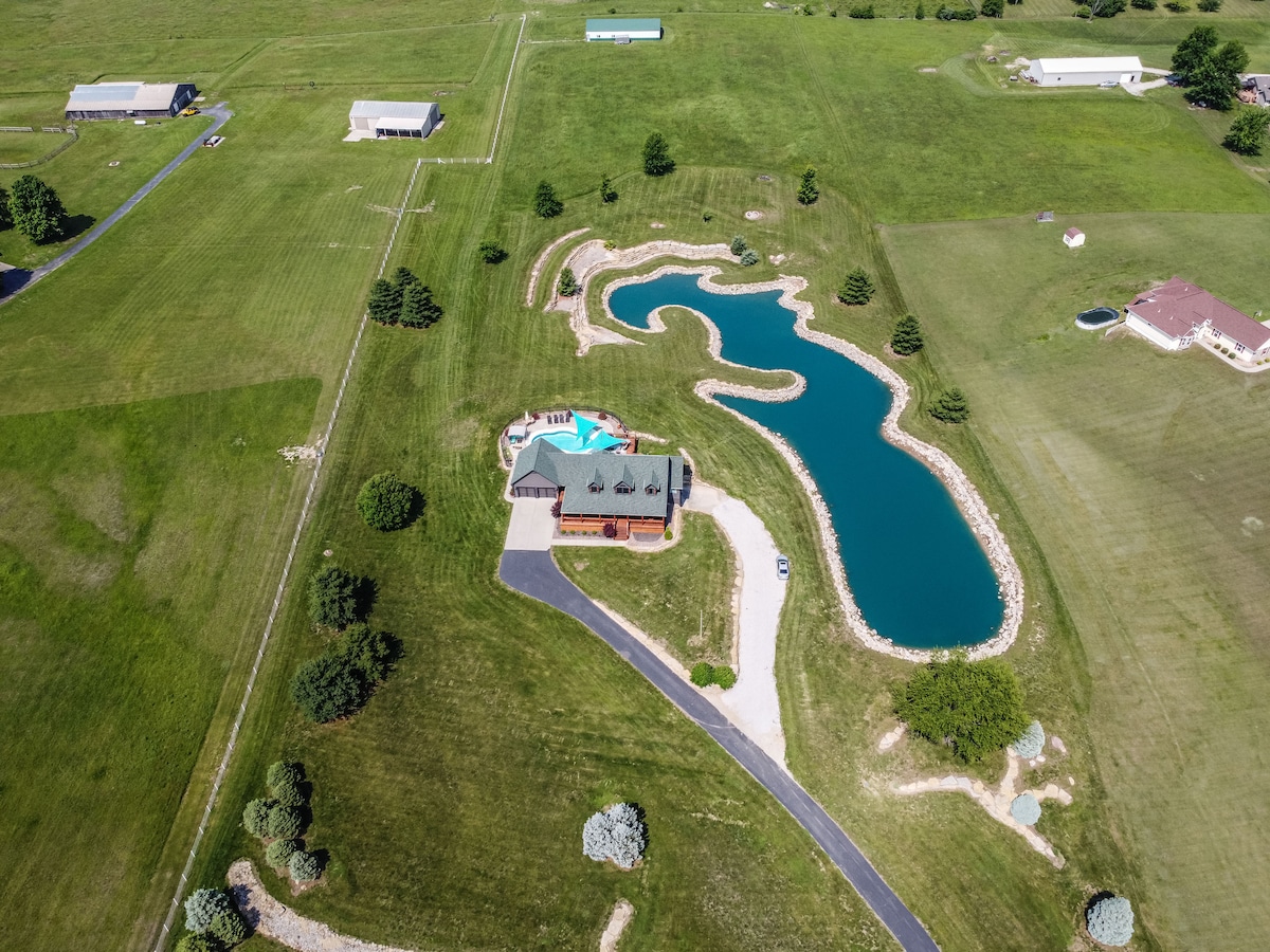 MILO FARM - SACRED LAND sits east of Kansas City & is a nature retreat w/ a cedar forest, a hardwood forest, 2 ponds, bohemian lodge, art studio, pool, barn, miles of trails & whimsical camping spots. Pet and feed the farm animals while you are here! Guests have lower level of the lodge to themselves with 2 suites (with private baths), rec room, bar area, laundry, steam sauna & rock sauna, play room & patio. Milo Farm is located just 30 minutes from KC. More info on MiloFarm.com