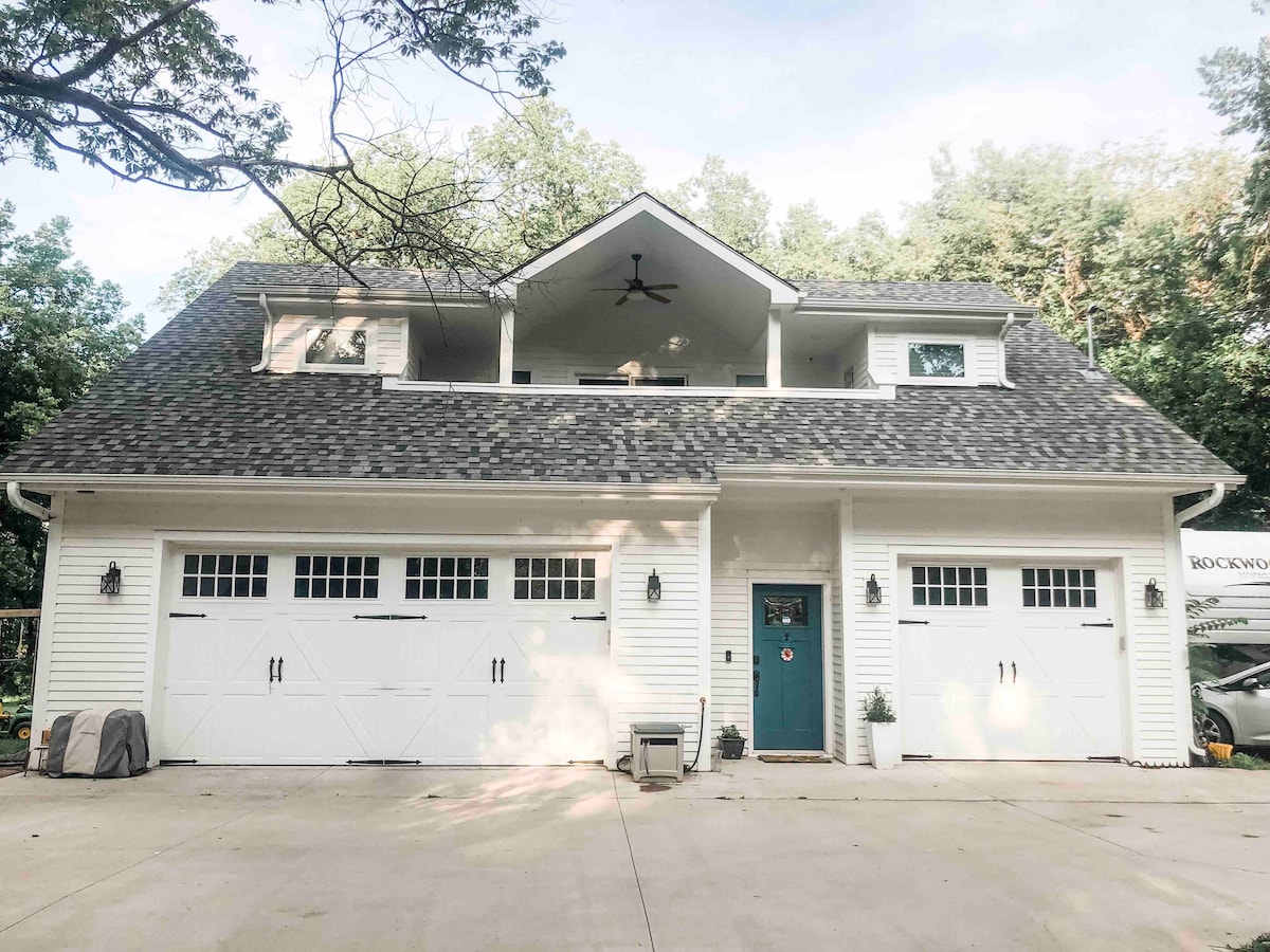 This carriage house sits on 2 acres, with the original 1860s house. Located 1 mile East of historic Mass. St. in Lawrence, KS, it has 3 BR & 2 bathrooms. Access is limited to the space above the garage (must climb stairs), private balcony, & the front/middle yard. Absolutely ZERO smoking OR vaping tolerated or allowed on premises! Be aware before booking! You must acknowledge & agree to the house rules when booking!