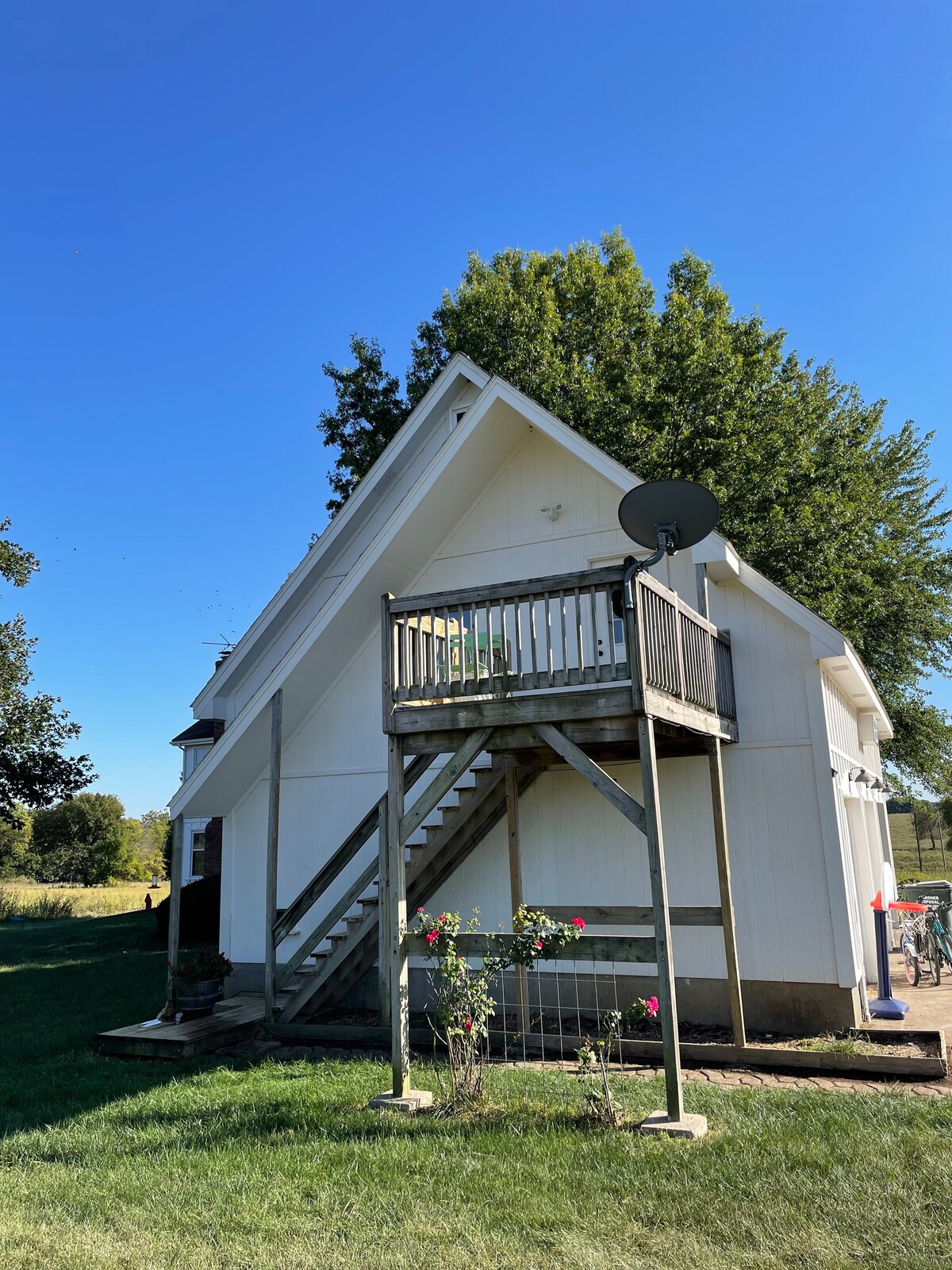 Quiet country stay just off I-70 with a playground and no pet fee! We welcome you to our rehabbed 1906 guest house with modern comforts on 10 acre farm. Double bed, twin bed, couch, futon in loft. New tiled bathroom with rainfall shower & wand, kitchenette, coffee station, record, CD & cassette player, games, packnplay, iron & board, smart TV, back deck, goldfish in tank to feed, horses and cattle, and farm cats. PETS MUST BE KENNELED WHEN NOT PRESENT