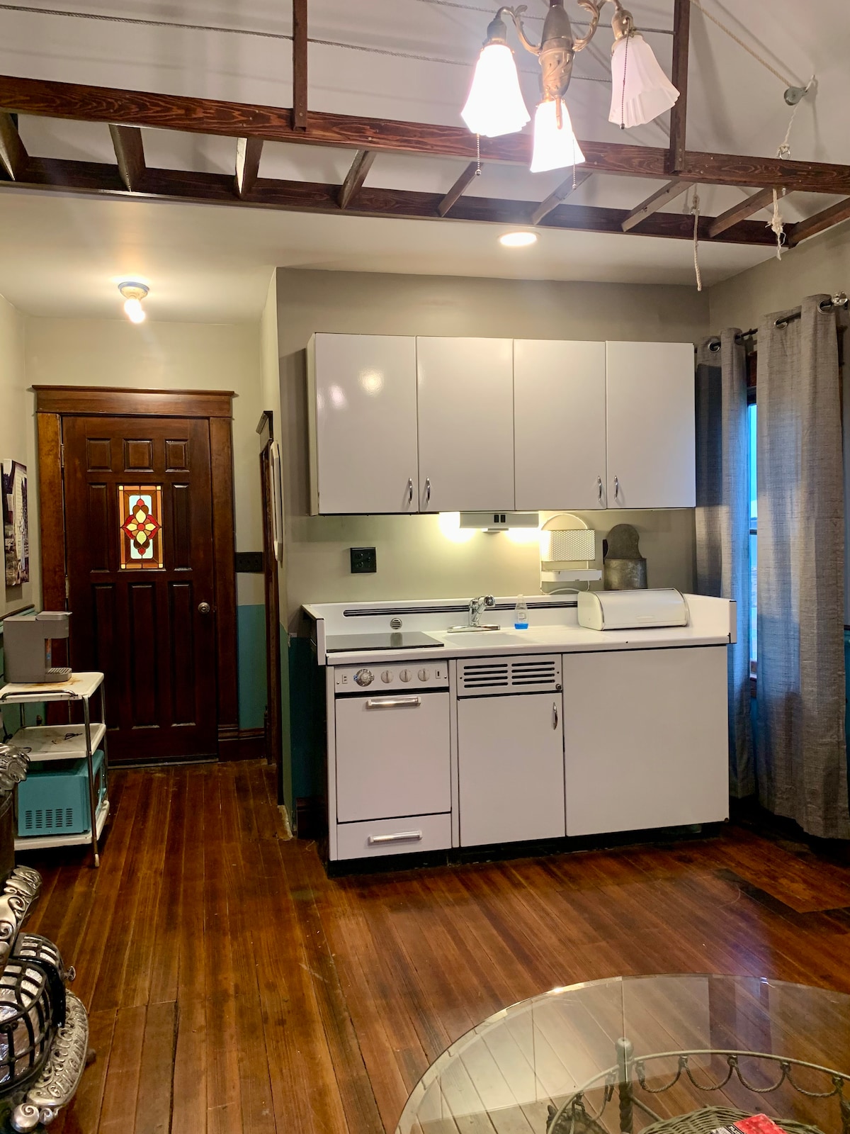 This 400 sq. ft. guesthouse (studio) on a historic property in Westwood, KS has recently been fully renovated and furnished. It has a completely equipped kitchenette, comfortable living area, along with a queen-size bed. The guesthouse also includes a washer/dryer off the kitchenette. The guesthouse is a separate dwelling located on a half an acre property which includes the original farmhouse built in 1889 - the guesthouse added in 1920. Westwood, Kansas is 2 miles from the Country Club Plaza.