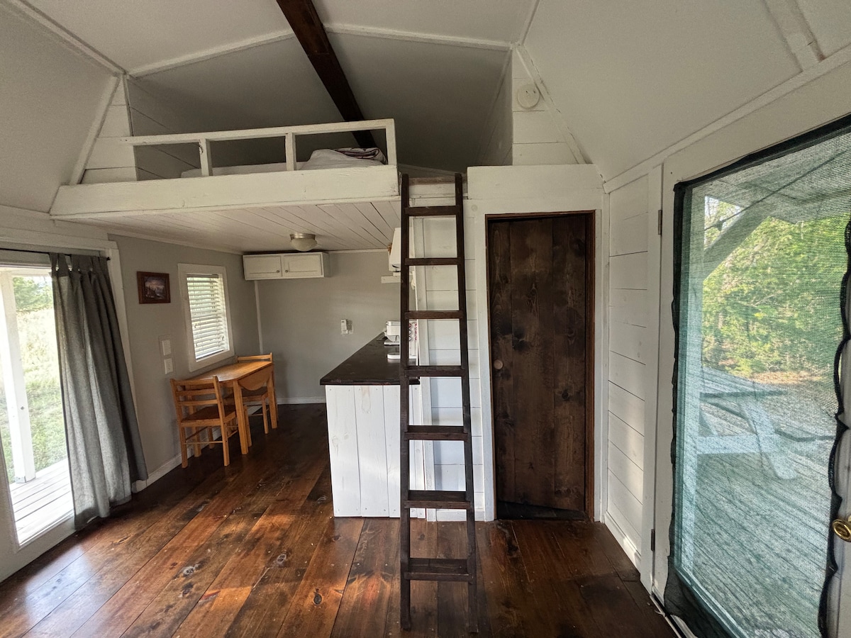Romantic getaway, family trip to the country, or a place to get away to study and work, this cabin in the woods is the place! Enjoy a night in our tiny house complete with a loft bed, living area, kitchen, full bathroom, and a private fire pit area in the back. There’s even an indoor pull-down screen and movie projector! Tucked away in a wooded area on our property. A great and peaceful cabin about 15 minutes from the westside of Wichita!