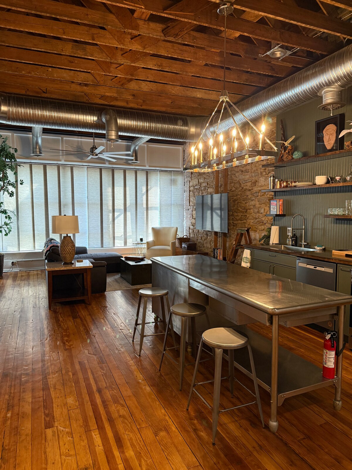 A large loft in a historic 1929 building. Fully appointed with all the items to enjoy a weekend or long term stay. Full Kitchen with all the cooking equipment as well as a wet bar. The 1929 refurbished loft has foosball table, shuffleboard, steel tip dart board and a baby grand piano! Two large smart TV's and a great view of the city. Located right above Bite Me BBQ, across the street from Norton's Brewery, and step out front turn left and you can see Intrust Bank Arena just a block away!