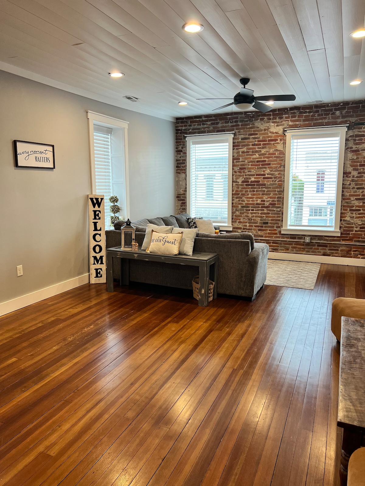 Look out at the pristine City Hall with the Statue of Liberty and a bronze sculpture marking the city where Honest Abe visited just before announcing his run for Presidency. The original bricks and hardwood in this unique 170-year-old home have stood the test of time. Take a an elevator (or stairs) to the 2nd floor. Located in the heart of historic downtown Leavenworth, the First City of Kansas. Within a few blocks are several coffee shops, bakeries, boutiques, and bars. Located only 10 miles from the award-winning tourist town of Weston, which has many breweries, wineries, and hiking trails. You won't find this anywhere else! Original wide hardwood floors that were laid 165 years ago and the original brick walls that have stood the test of time. A view from nine windows that overlook our pristine city hall with the statue of liberty and statue of Abraham Lincoln. (Lincoln announced his run for presidency right there in Leavenworth!) And to think, he most likely walked across the street and came in our building as it was a saloon at the time! You will enter our loft from the street by keypad and there is a small room leading to our new elevator (big steel door) to take you to the 2nd floor. Directions for the elevator are on the wall. Very easy, just always close the white accordian door to elevator in case your party calls it from another floor. Your party is the only people who have access to this elevator. Check in is between 4 and 7pm. Please drop us a text if it is not in that time frame. Check out is 11am. Again, please drop us a text if you need more time! Mac and Stacy are always just a text away and can be there within 10 minutes. #913-651-7798. Text us with any questions! Ride a custom elevator to the open yet cozy space above the host's candle and gift boutique. The flat is a great base to explore KC, Fort Leavenworth, the county seat, and quaint Weston, MO. Shops, restaurants, coffeehouses, and bars are steps away. There is a large parking lot behind the building on 5th street. 65" tv, but we do not have cable. There is a dvd player, and you are welcome to hook your phone to the tv to watch your prime video, hulu, etc. That is what we do, and use the data from our phone or computer to display on the tv screen!