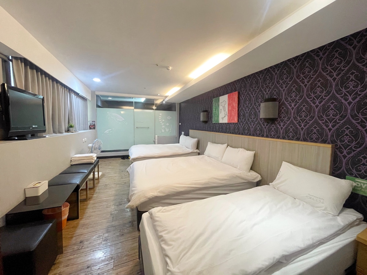 家庭房ㄧ雙床加一小床|獨立衛浴|近鹽埕埔捷運站、愛河、駁二