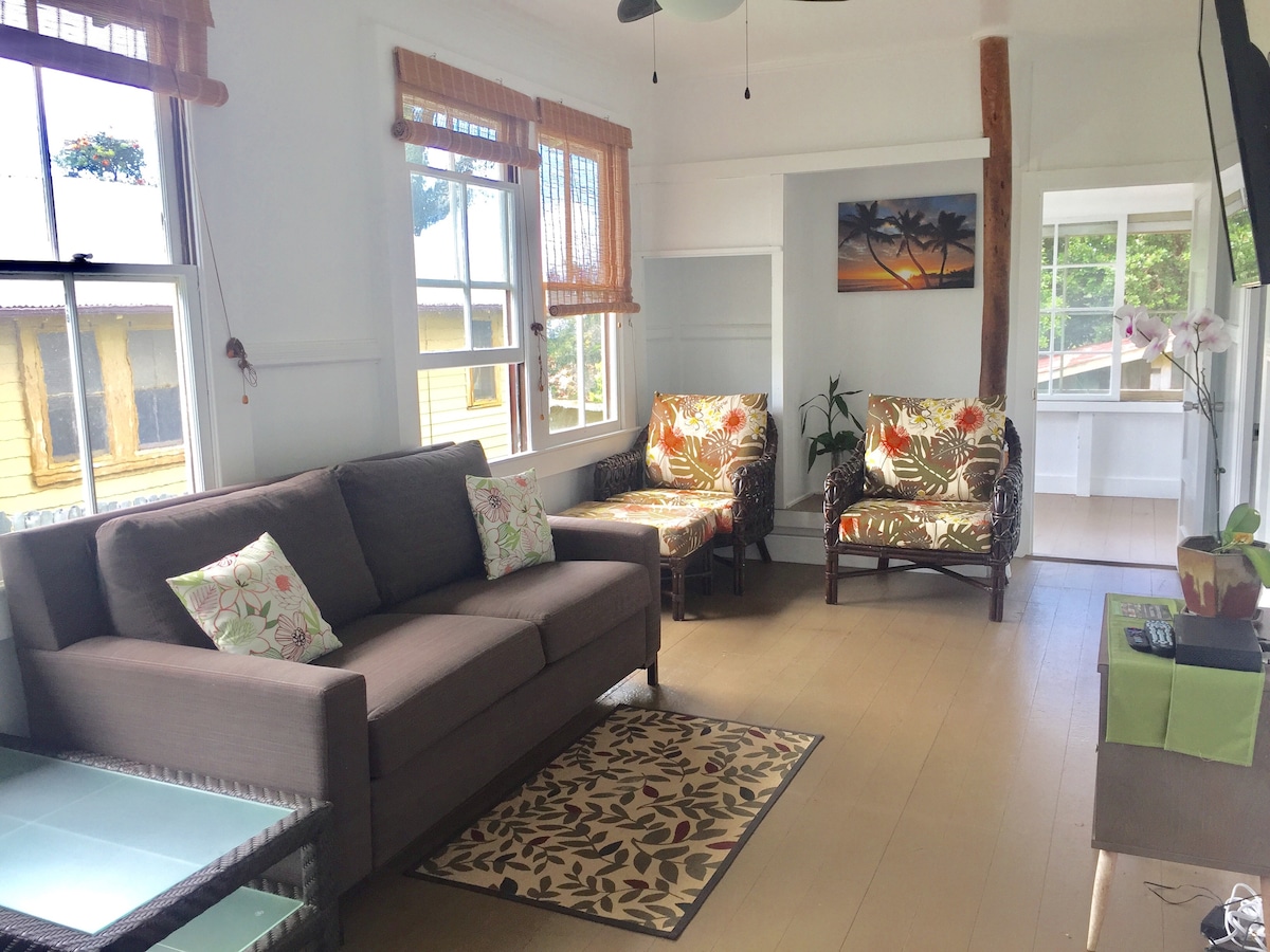 The guest suite is accessed via a private entrance. The kitchen is fully equipped and has a bay window dining area. Step through the double French doors and relax on the 34 feet veranda with views of the ocean and Maui. The living room is furnished with heirloom heritage koa furniture and a pune’e (day bed) for lounging. The bedroom is appointed with a luxury Stearns & Foster pillow top queen bed and accented with Hawaiian design quilted pillows. Need internet connectivity? Sit at the Tommy Bahama desk in the study and connect to the free wi-fi or hard wire. 50” flat screen TV. Full range 2.1 speaker system to plug into your smartphone or music source. Choice Hawaiian CDs are available for your listening pleasure as are a cooler, beach towels, mats and sand chairs for your beach outings.