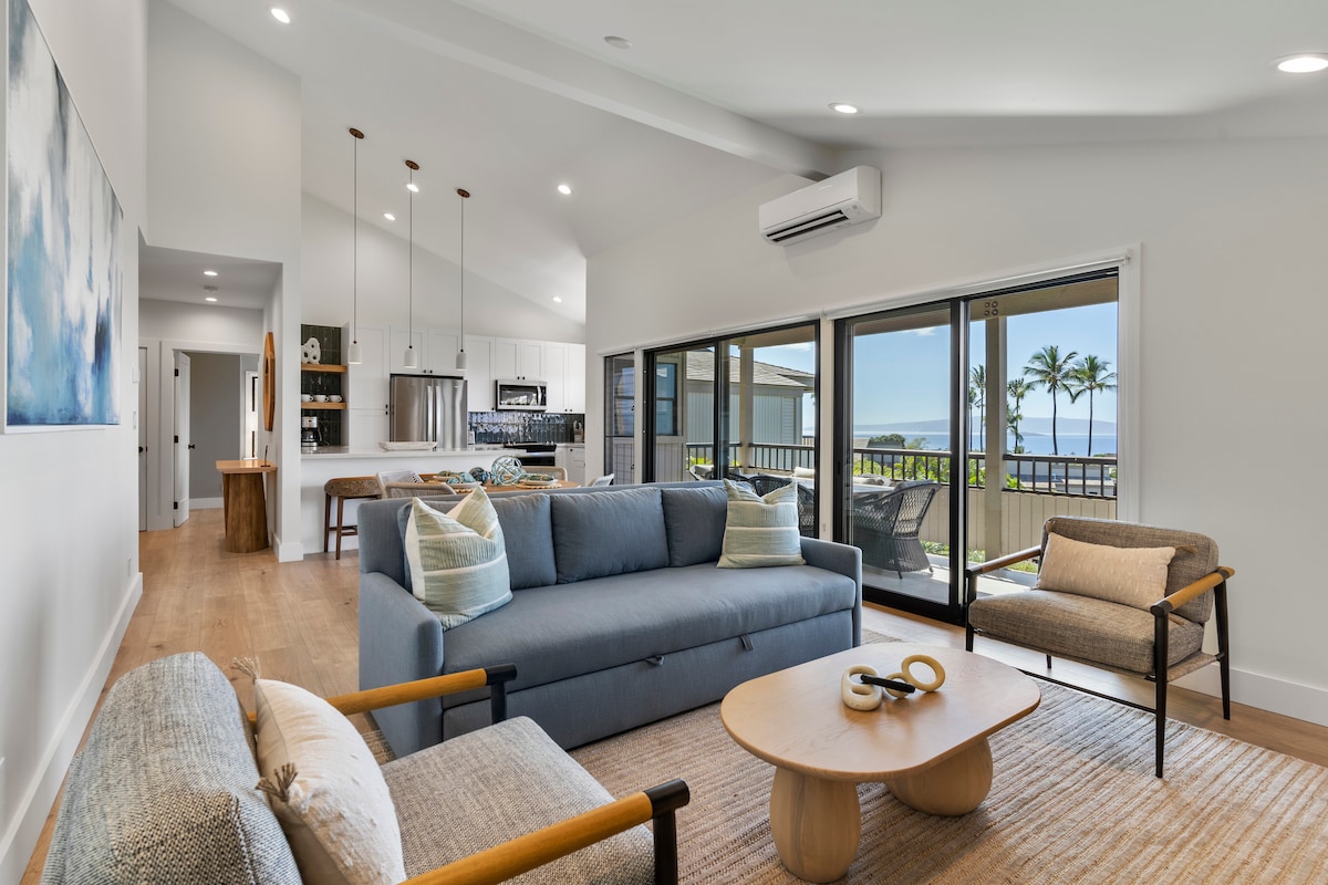 Bask in the breathtaking ocean views from our Maui penthouse! Centrally located, our beautifully remodeled suite offers full beachfront, ocean and pool access. The master bedroom features an incredibly comfortable California king bed with an en suite bathroom and stone walk-in shower. There is also a king size cozy sleeper sofa in the living room which has direct access to the second full bathroom. The modern kitchen is fully equipped with everything you need!